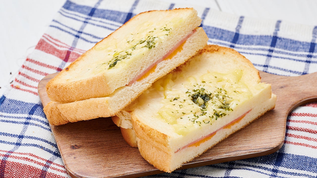 食パンにスライスチーズとポークハムを挟み、グラタンソースで仕上げた朝食にぴったりの商品です。