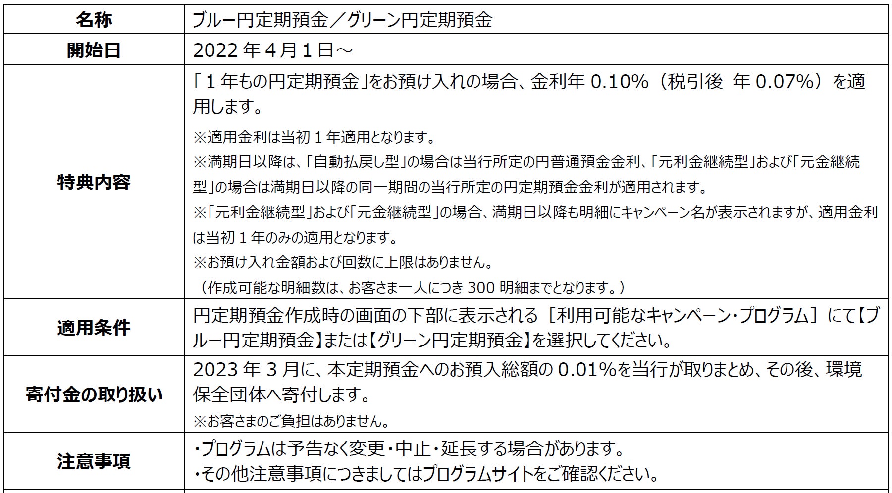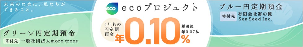 「ブルー円定期預金」「グリーン円定期預金」プログラムを開始します。「ブルー円定期預金」にお預け入れいただくと「海洋保全団体」へ、「グリーン円定期預金」にお預け入れいただくと「森林保全団体」へ、それぞれお預け入れいただいた金額の0.01%を、auじぶん銀行が寄付します。