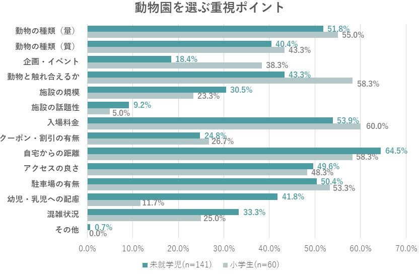 - 動物園の重視ポイントは多数。「自宅からの距離」「入場料金」「動物の種類」など