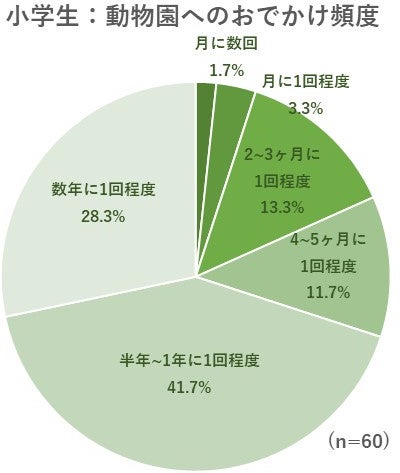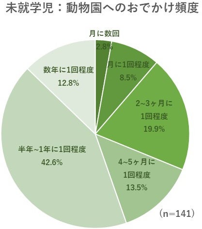 - 動物園へのおでかけ頻度は「半年~1年に1回程度」がもっとも多く、小学生より未就学児の方が頻度が高い