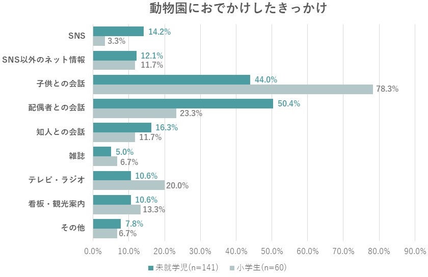 - 動物園に行ったきっかけは未就学児の場合「配偶者との会話」か「子供との会話」、小学生の場合「子供との会話」
