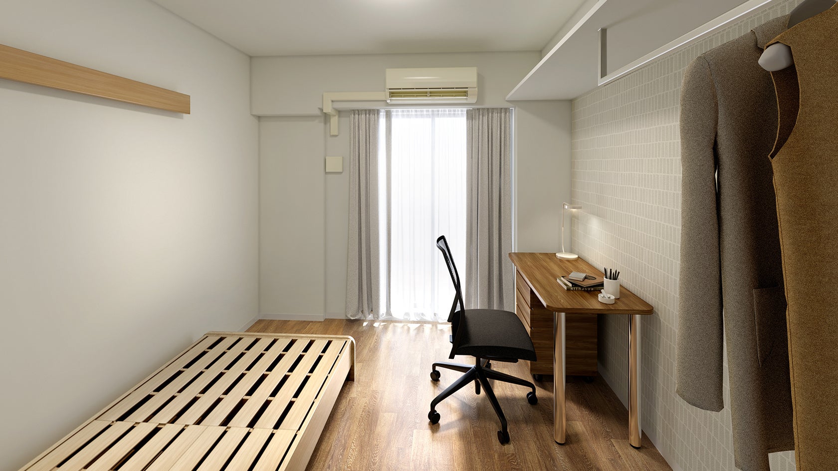 居室には入居当日から快適にお住まいいただくため、生活に必要な家具・家電を備え付けており、洗濯機・冷蔵庫・電子レンジも完備しています。