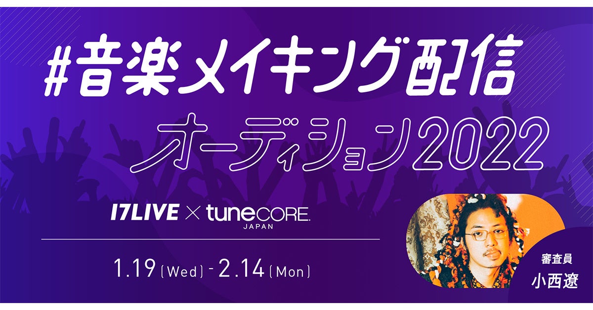 17LIVE株式会社(東京都港区、代表取締役:小野 裕史、URL:https://jp.17.live/)が運営する日本No.1(※1)ライブ配信アプリ「17LIVE(ワンセブンライブ)」は、音楽配信ディストリビューションサービス(※2)「TuneCore Japan」と初めてコラボレーションし、音楽業界で多岐に渡り楽曲提供を行う小西遼氏を審査員に迎え、2022年の幕開けを飾る大型音楽オーディション企画「#音楽メイキング配信 オーディション 2022」を、2022年1月19日(水)より開催することが決定しましたので、お知らせいたします。