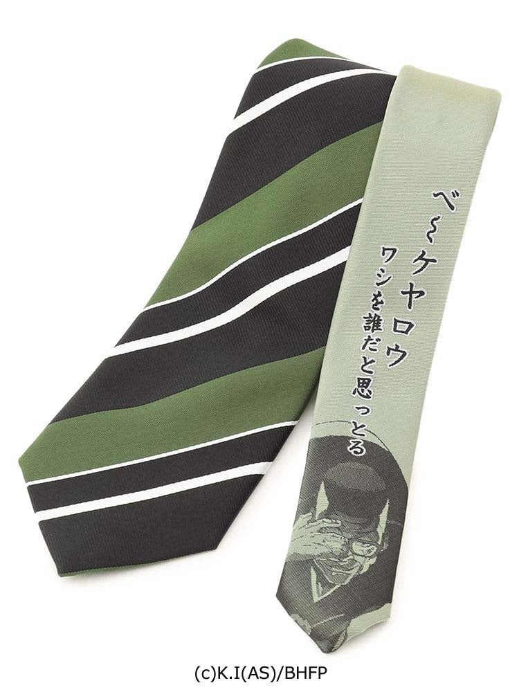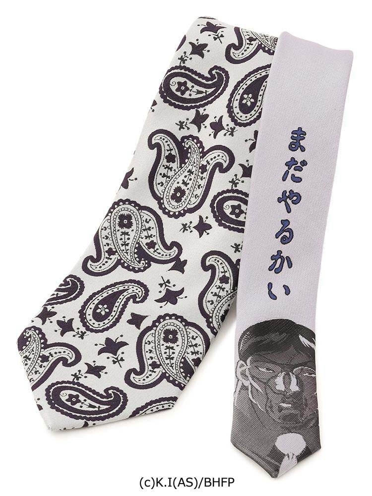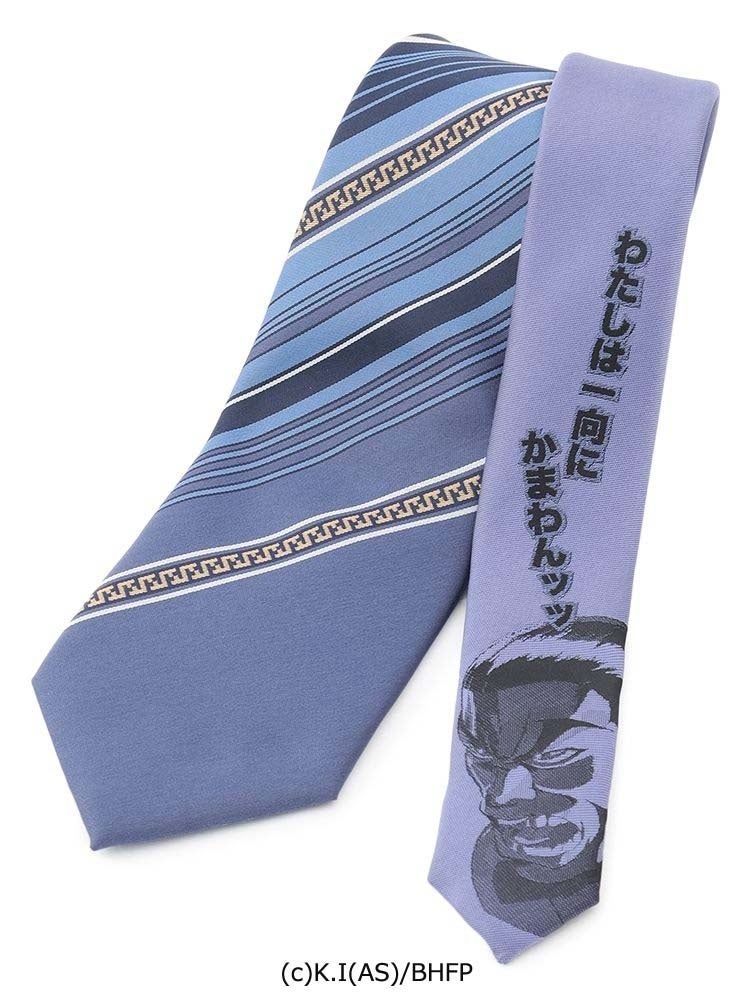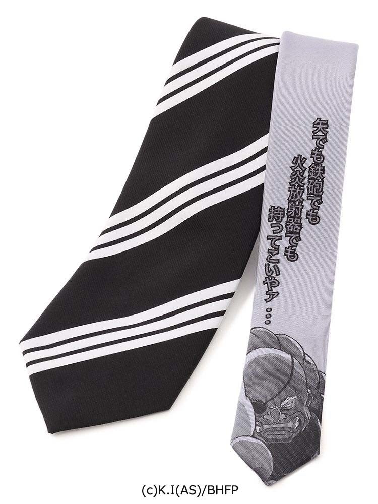 アニメ「範馬刃牙」のメインキャラクター達をモチーフにしたネクタイ。小剣側には各キャラクターとセリフをあしらいました。「範馬刃牙」の世界観を色柄で表現しています。大剣は、スタンダードなストライプ柄やコーディネートのアクセントになるペイズリー柄など、ビジネスシーンに馴染む1本に仕上げています。