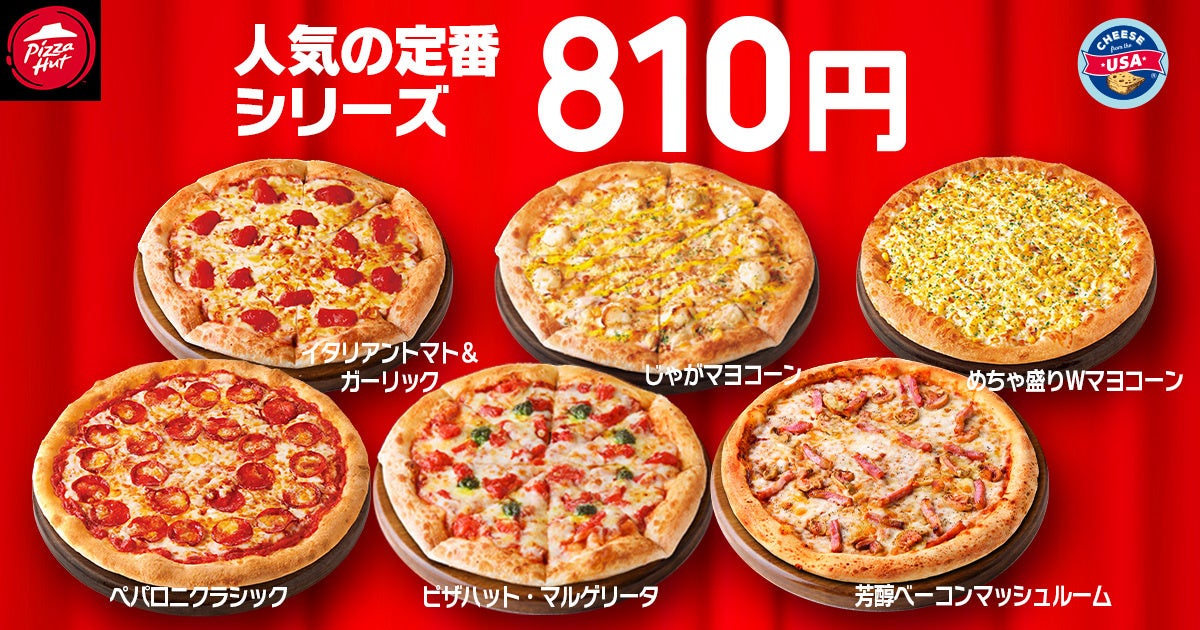 ※対象ピザ:「イタリアントマト&ガーリック」「じゃがマヨコーン」「めちゃ盛りWマヨコーン」「ペパロニクラシック」「ピザハット・マルゲリータ」「芳醇ベーコンマッシュルーム」