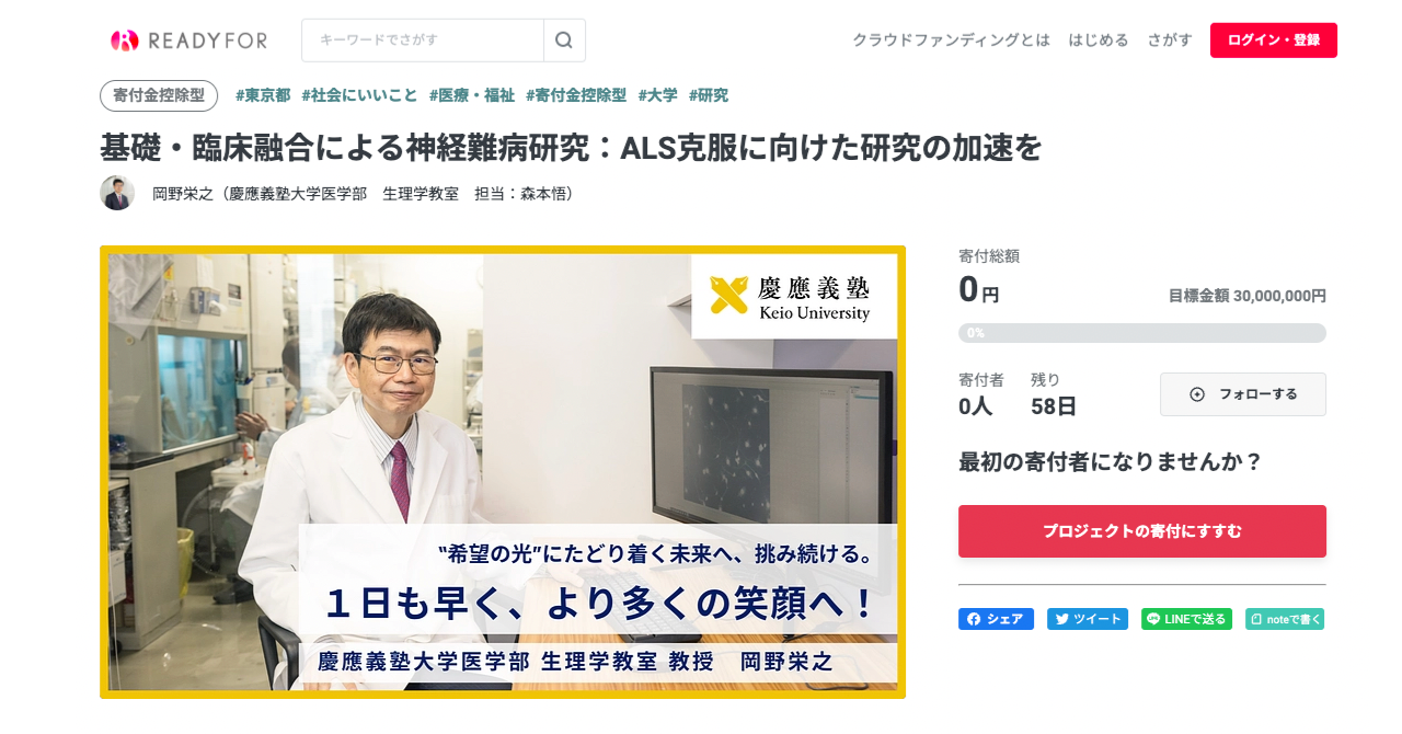 提携後第一号として、4月26日(水)9時よりクラウドファンディングプロジェクト「基礎・臨床融合による神経難病研究:ALS克服に向けた研究の加速を」を公開し、寄付金の募集を開始しました。