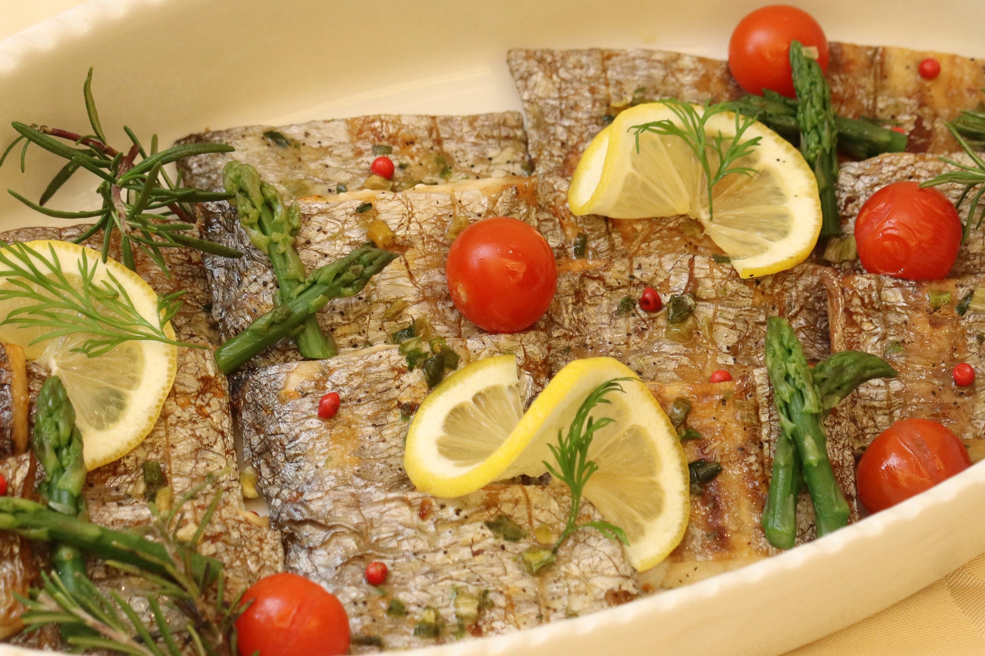 ふんわりきめ細かい身質の太刀魚をオーブンで焼き上げました。スパイス・ハーブとの相性は抜群です。