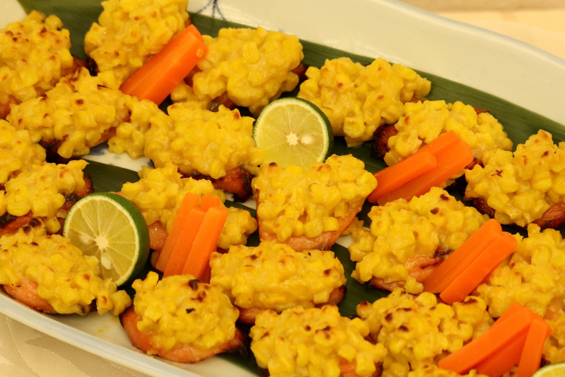 脂の乗ったサーモンにトウモロコシと甘味噌を乗せて直火で香ばしく焼き上げました。