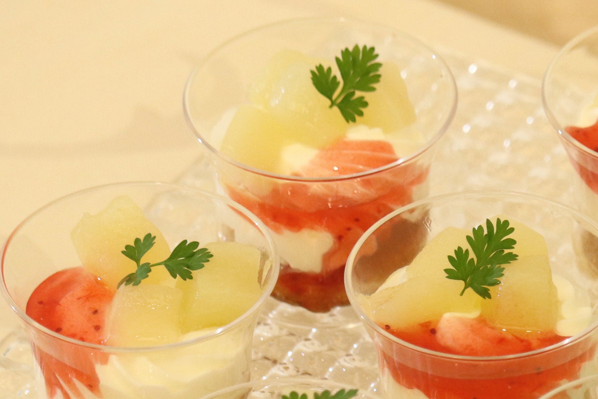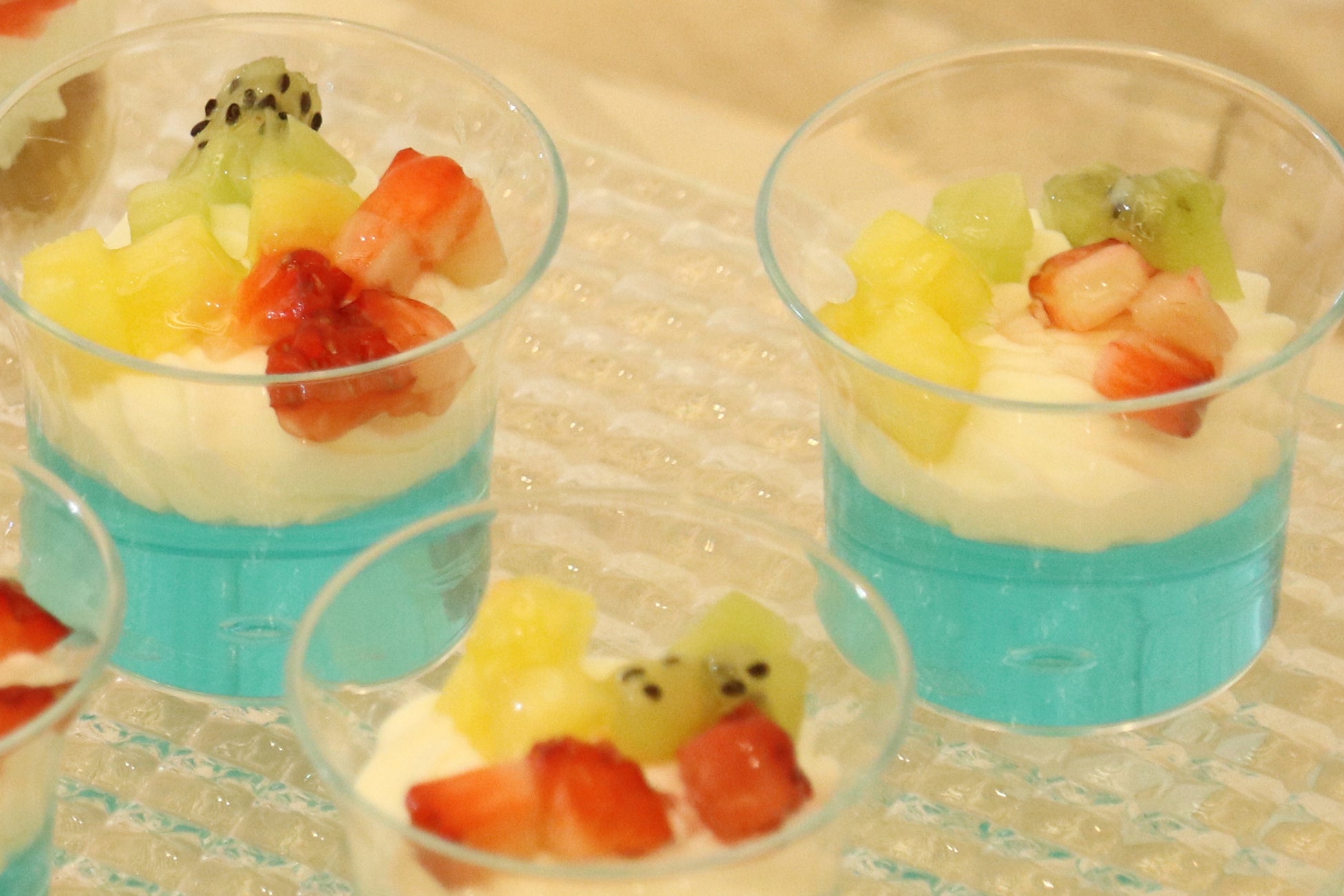 空色のゼリーと白いクリーム・カラフルなフルーツをブルーハワイをイメージしてカップデザートに仕上げました。