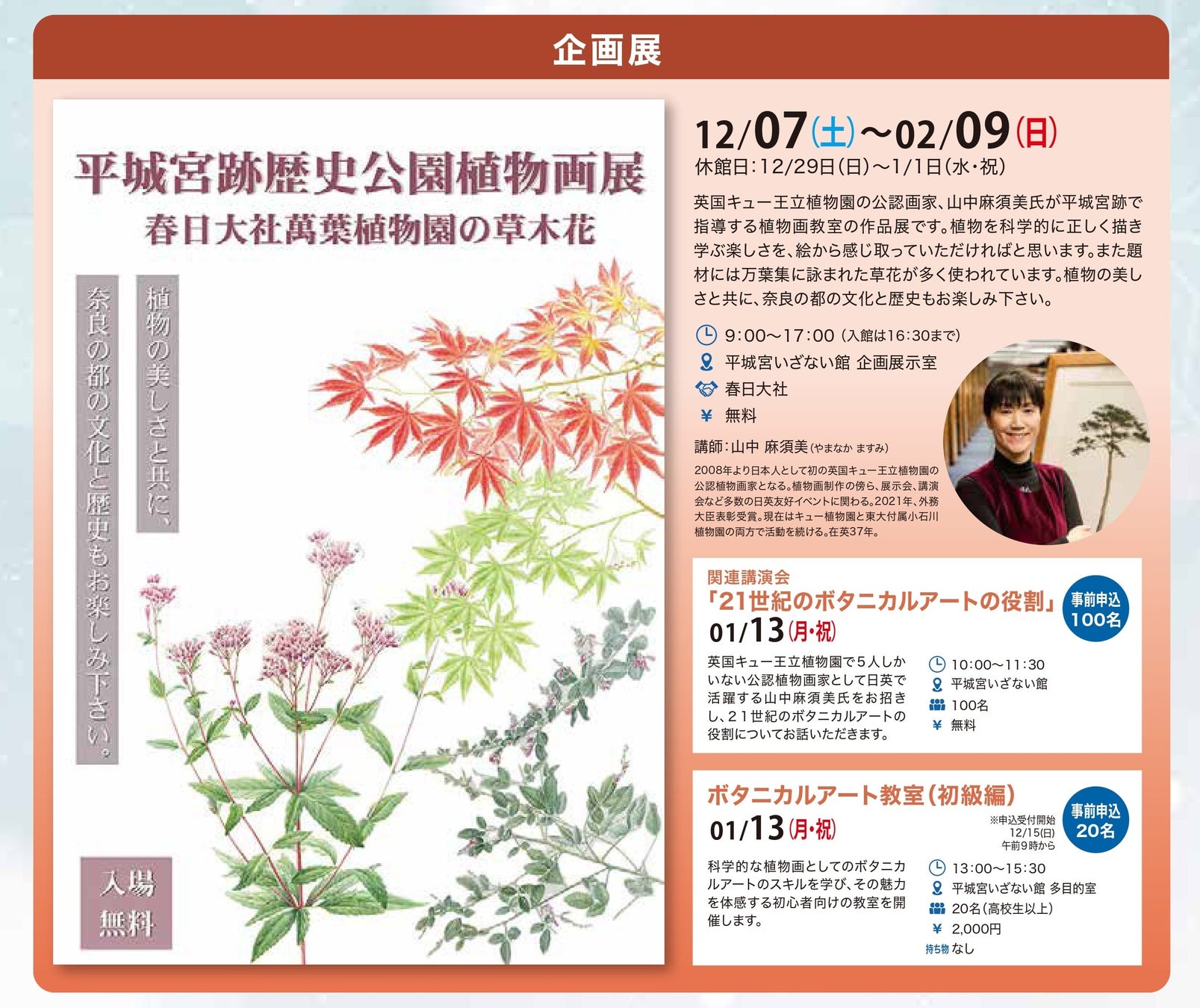 あわせて1月13日には関連講演会も開催。山中氏が「21世紀のボタニカルアートの役割」についてお話いたします。