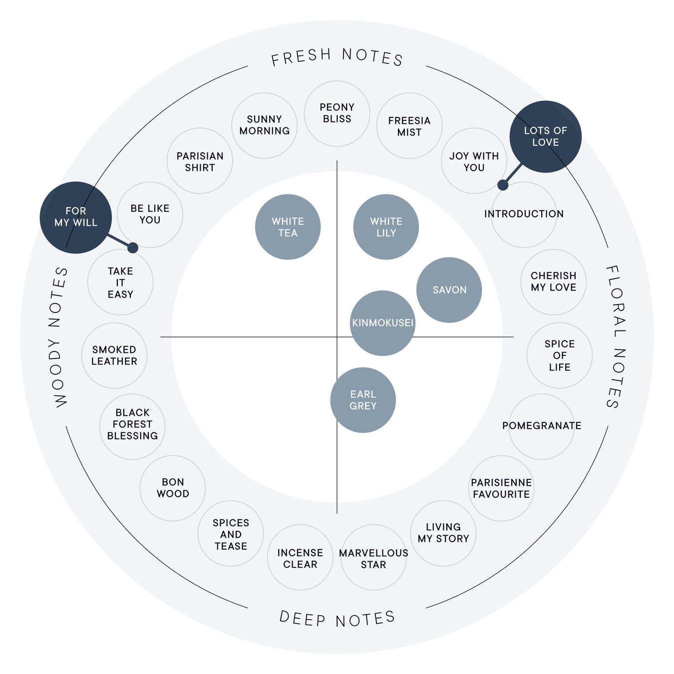 「LOTS OF LOVE」は、華やかなフローラルを重ね、人への“愛と感謝”を。「FOR MY WILL」は、ウッディノートを中心にさまざまなノートを組み合わせ、人との出会いによって育まれた“想いと情熱”をイメージし、香りで表現しました。