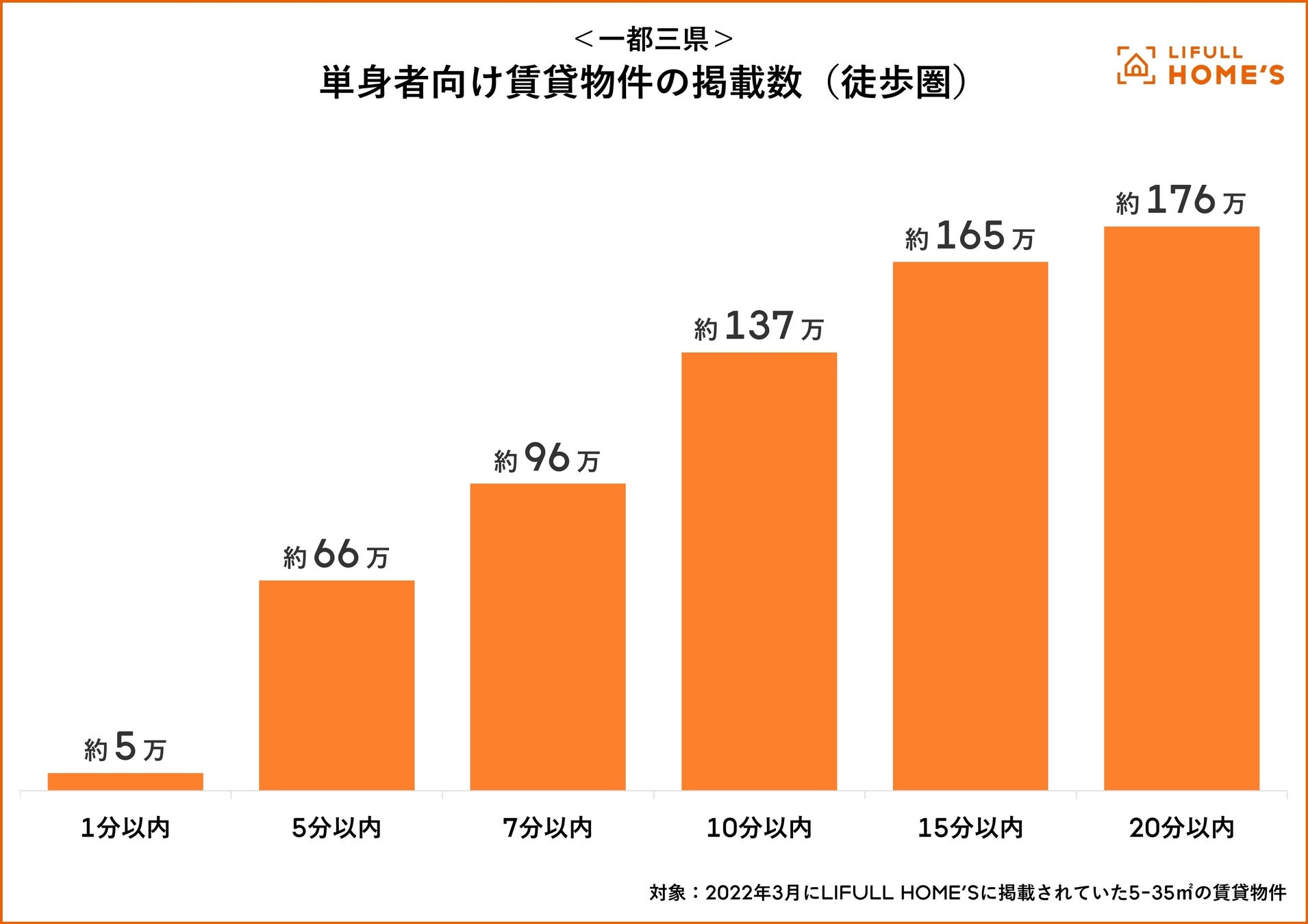 5分以内から10分以内に広げると70万以上も掲載物件数が増加!駅から離れることでのメリットも