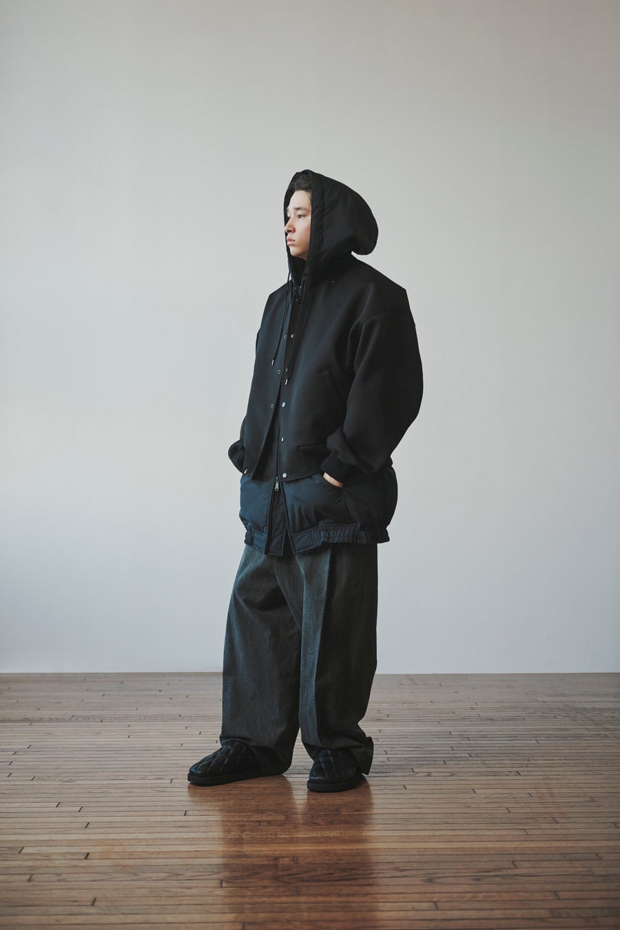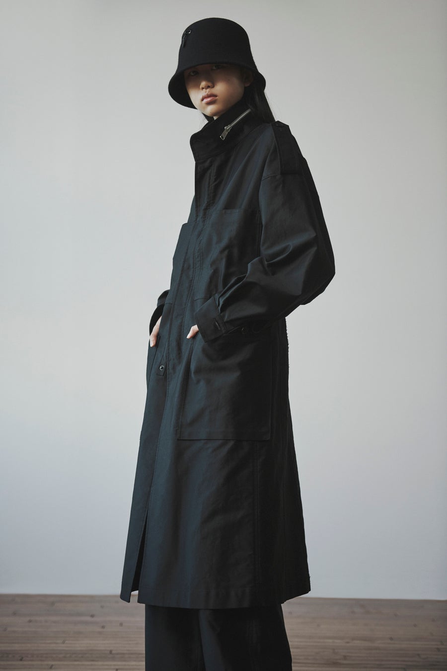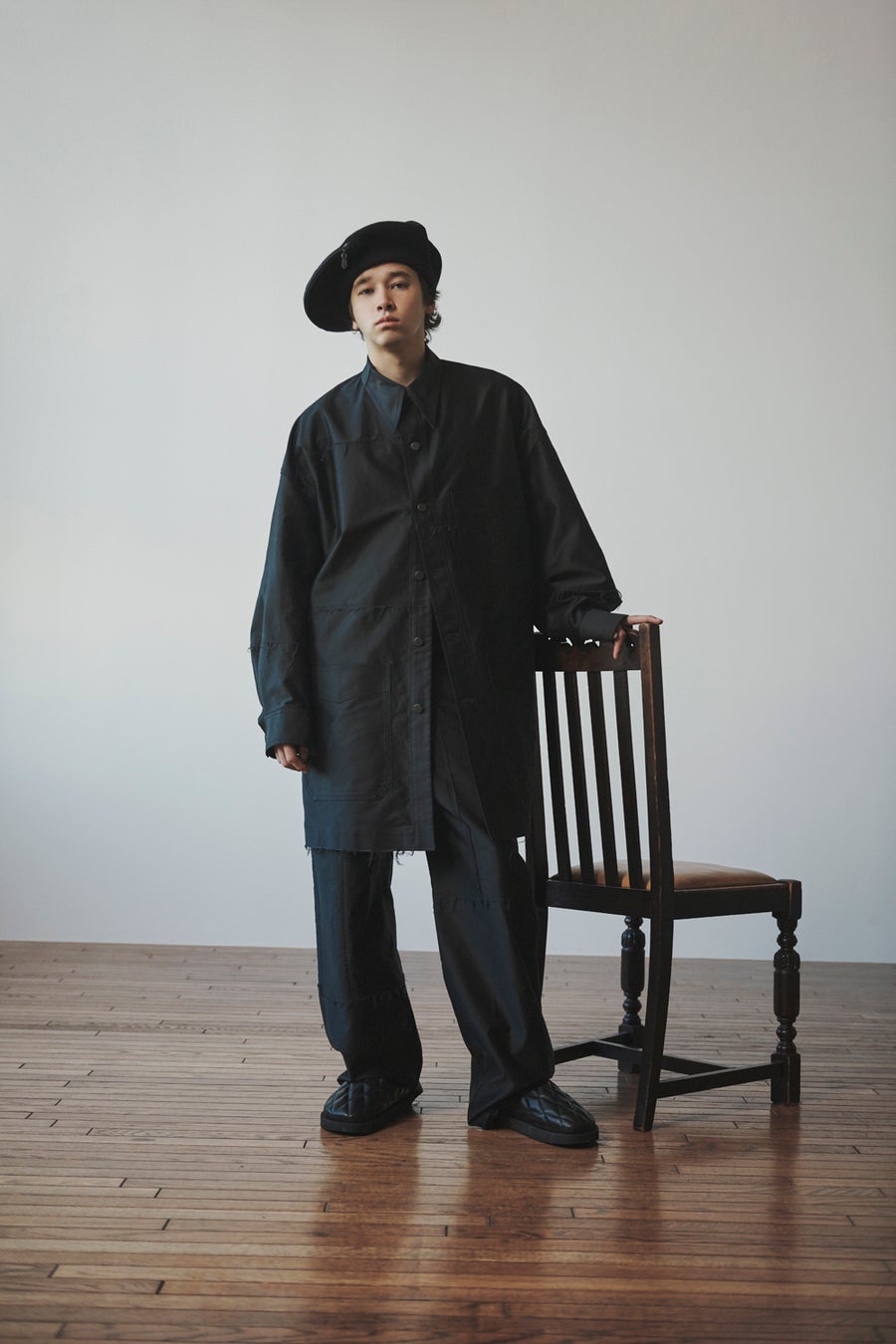 古い軍物の生地を復刻した古軍サージでつくられたレイヤードロングコート。ダブルブレストコートの袖を断切り、ワークテイストのフード付きコートの上にばさっと羽織ったような仕上げ。雑味とディテールの特徴あるフォルムがユニークな表情をつくる。