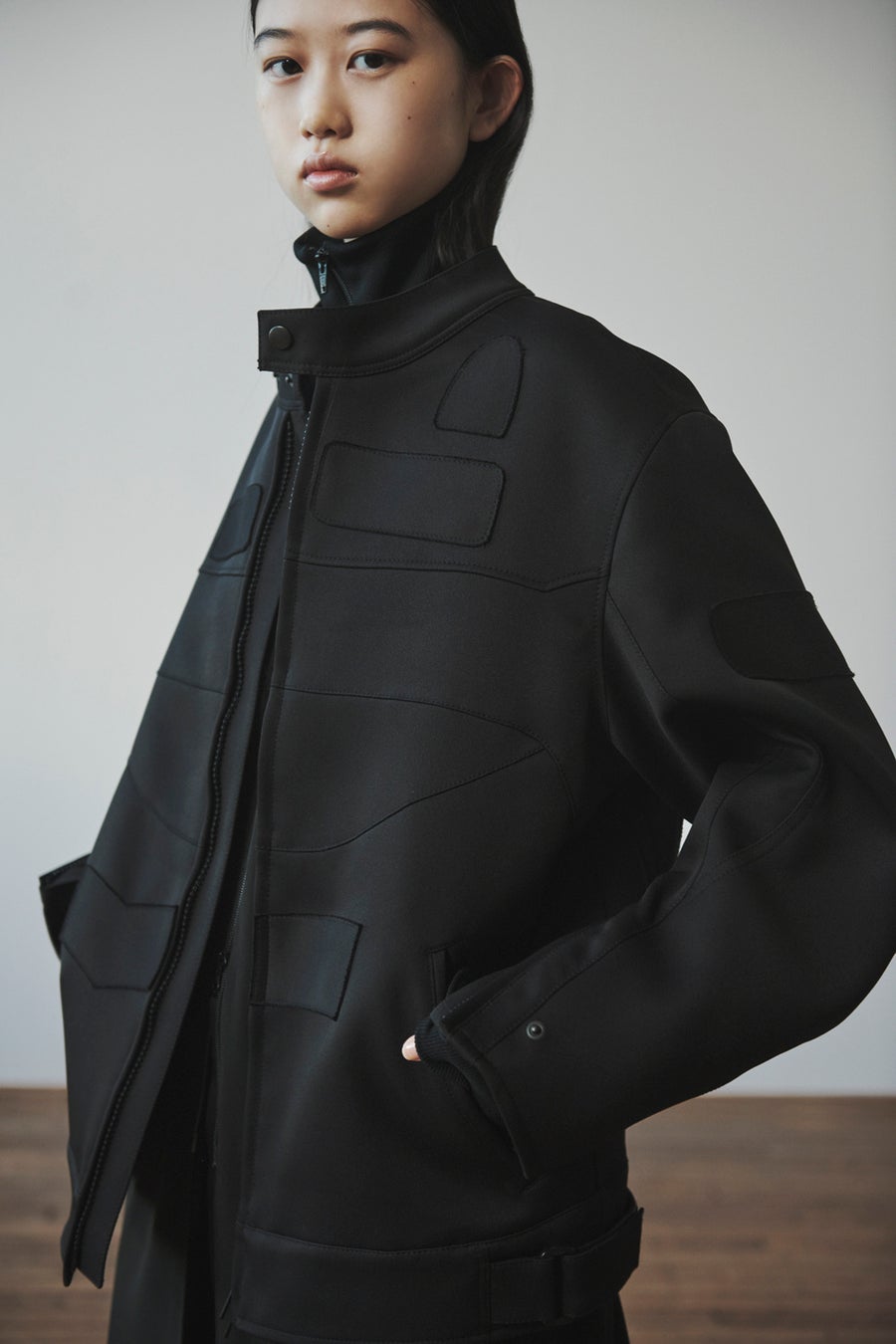 生地が接ぎ合わされ、柄のようになったライダースブルゾン。黒だけで構成されるグラフィカルな表現。独特のふくらみ感とハリ感が特徴の三重織の生地は、シワになりにくく、撥水性もあるポリエステル素材。服を作るときのパターン(型)のパーツがランダムに置かれたような、無造作な魅力のあるウェア。