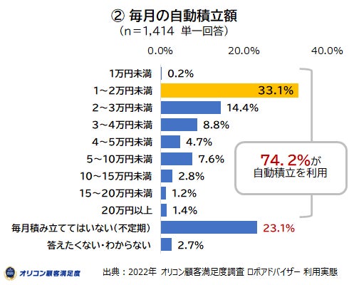 まず、①【運用開始時の初期投資額】(単一回答)では、「10~30万円未満」が30.0%と最も多く、次いで「50~100万未満」が14.3%、「30~50万円未満」が12.1%と続きました。つづいて、②【毎月の自動積立額】(単一回答)では、「1~2万円未満」が33.1%で最も多く、全体の74.2%が自動積立を利用中と回答。口座開設時の最低初期投資額からスタートし、毎月積立を行いながらロボアドを活用している人が多いことが伺えます。