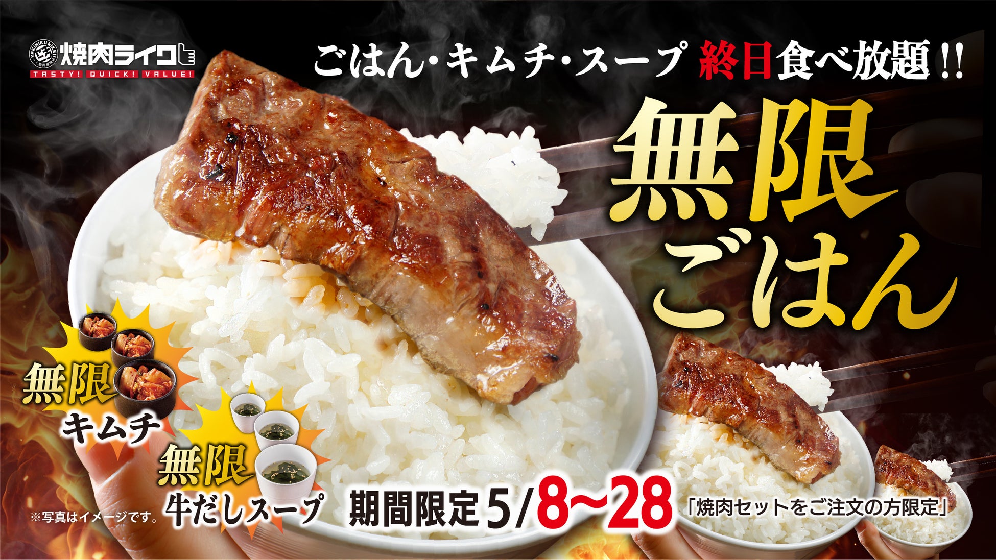 【焼肉ライク】GW明けだからこそ、焼肉とひたすら無限ごはんで元気に!ごはん・スープ・キムチがおかわり放題のキャンペーンを5月8日から期間限定で全店にて開催!