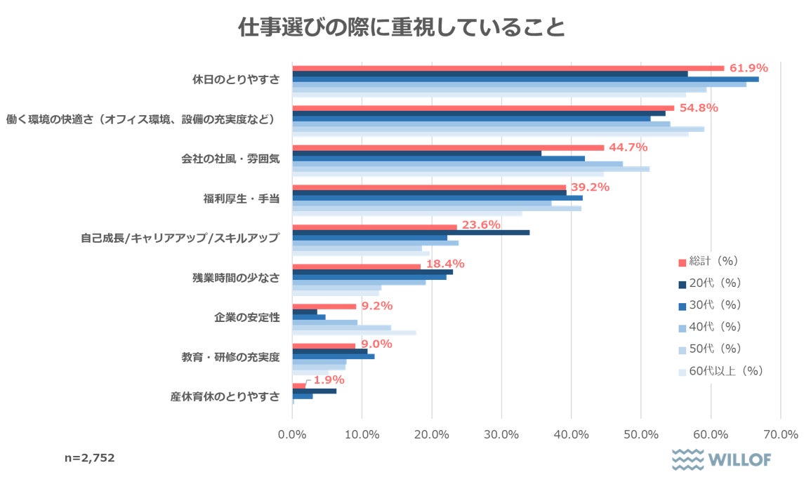 次に【仕事選びの際に仕事内容・給与・勤務地以外で重視するポイント】について聞いたところ「休日の取りやすさ(61.9%)」が最も多く、年代別で見ると30代と40代で相対的に高い結果となりました。次に多かった回答は「働く環境の快適さ(54.8%)」となり、特に50代で高い結果となりました。