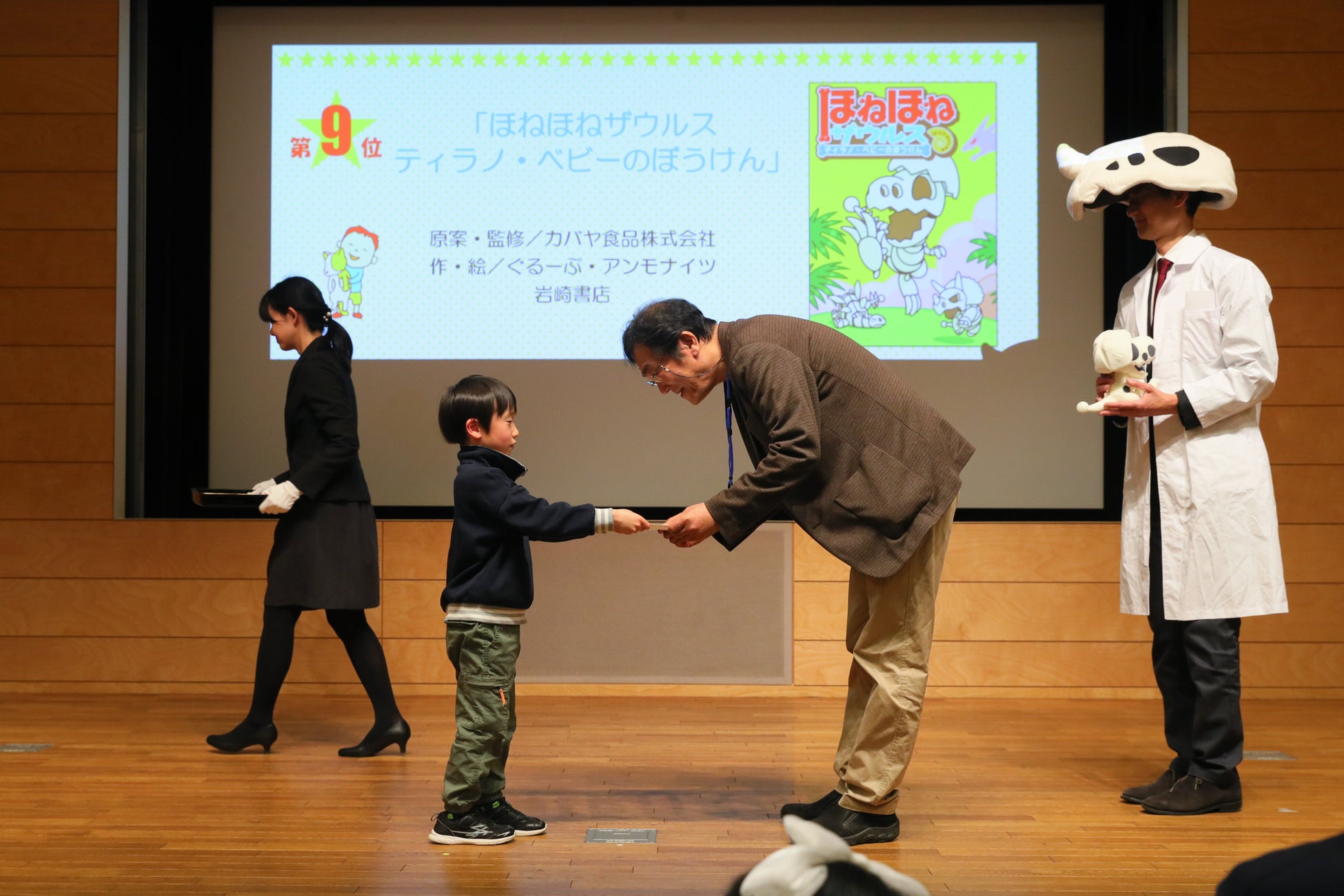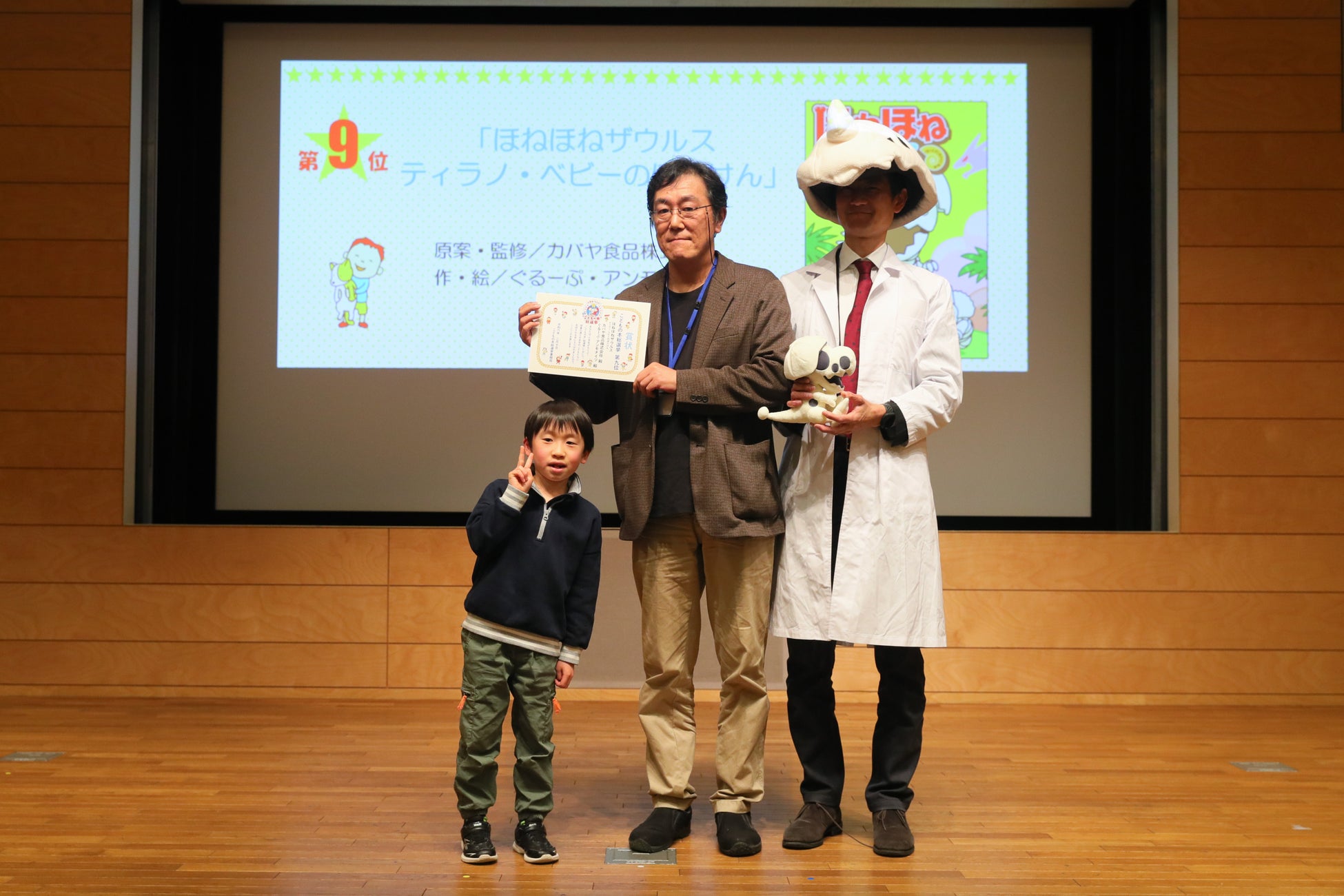 入賞した「ほねほねザウルス」からは「ぐるーぷ・アンモナイツ」(著作)のメンバーより、今井修司先生(作画)、ドクター・ヨッシー先生(原案・カバヤ食品株式会社)が登壇し、こどもプレゼンターより賞状をいただきました。