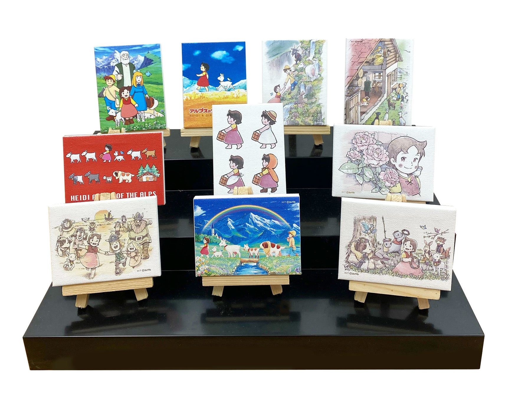 小さなキャンバスボードに、ハイジのアニメ名シーンや「ビッケ」や「ロッキーチャック」とのコラボ柄まで、魅力たっぷりの絵柄が全10種。シークレットパッケージでワクワク感も楽しめます。
