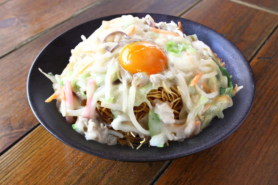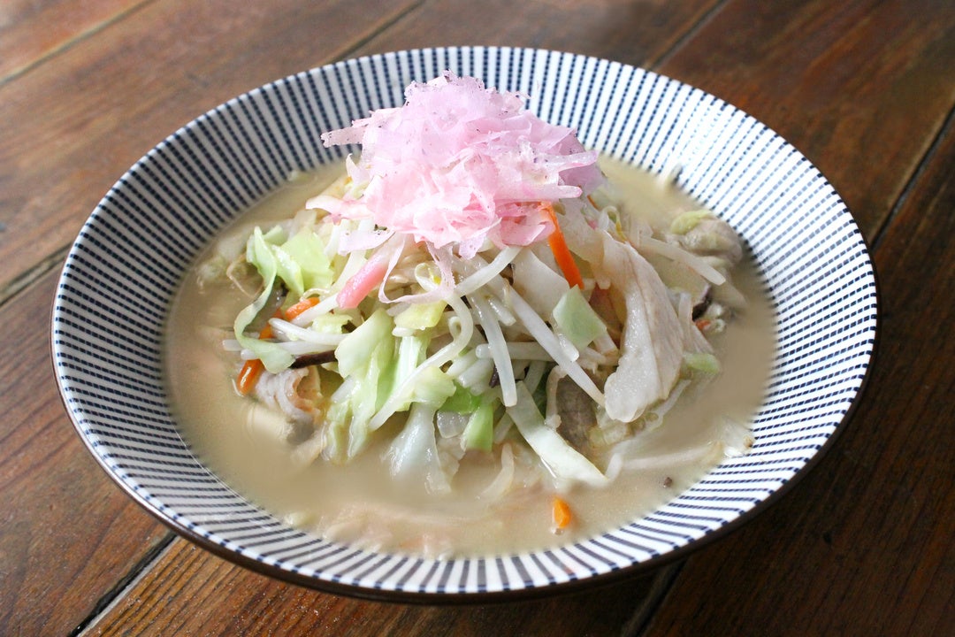 パリパリの麺に、熱々の純白鶏豚骨スープをかけた野菜あんかけです。
