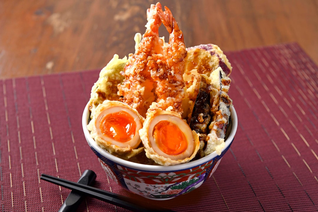 味玉天ぷらとサクサク天かすに特製天丼タレを掛けました。
