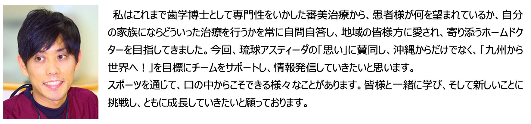 琉球アスティーダスポーツクラブ株式会社(所在地:沖縄県中頭郡中城村、代表取締役会長:早川周作)は、グループチームのTリーグ女子 九州アスティーダにおいてオフィシャルデンタルパートナーの渡辺通駅加納歯科クリニック 福岡(所在地:福岡市中央区、院長:加納拓、以下加納歯科クリニック 福岡)によるデンタルサポートを行っています。この度、九州アスティーダ所属の田口瑛美子選手より、コメントが届きましたので発表いたします。
