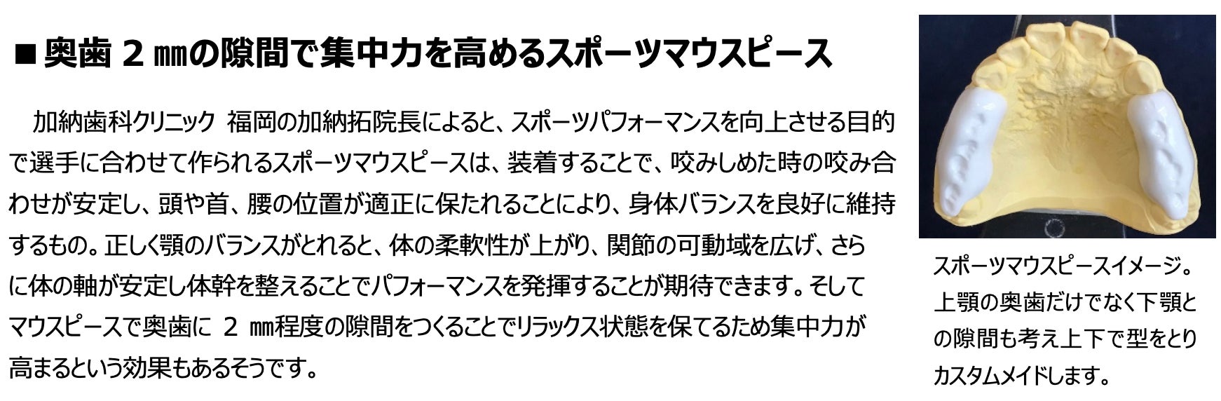 なお、スポーツパフォーマンス向上を目的としたマウスピースではコンタクトスポーツでの保護用のものと異なり、奥歯だけに装着することで違和感を軽減。頭蓋骨と一体で安定感がある上顎のみに装着するのですが、歯型を上下両方とることでより高い装着感と個人に合わせたカスタマイズができます。