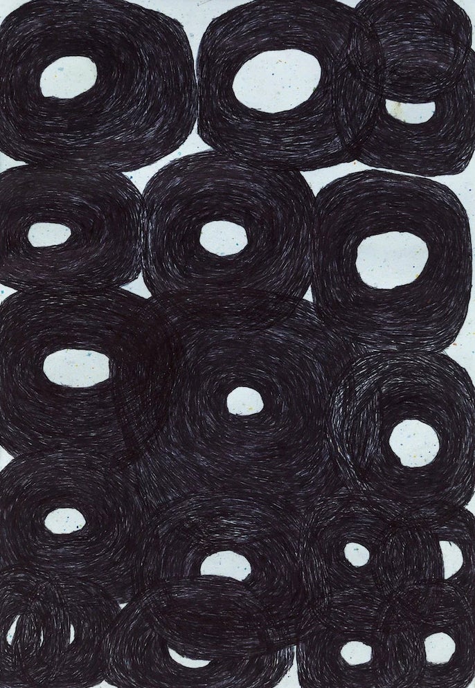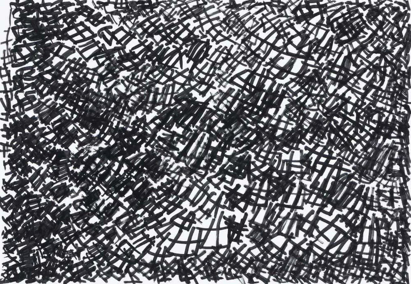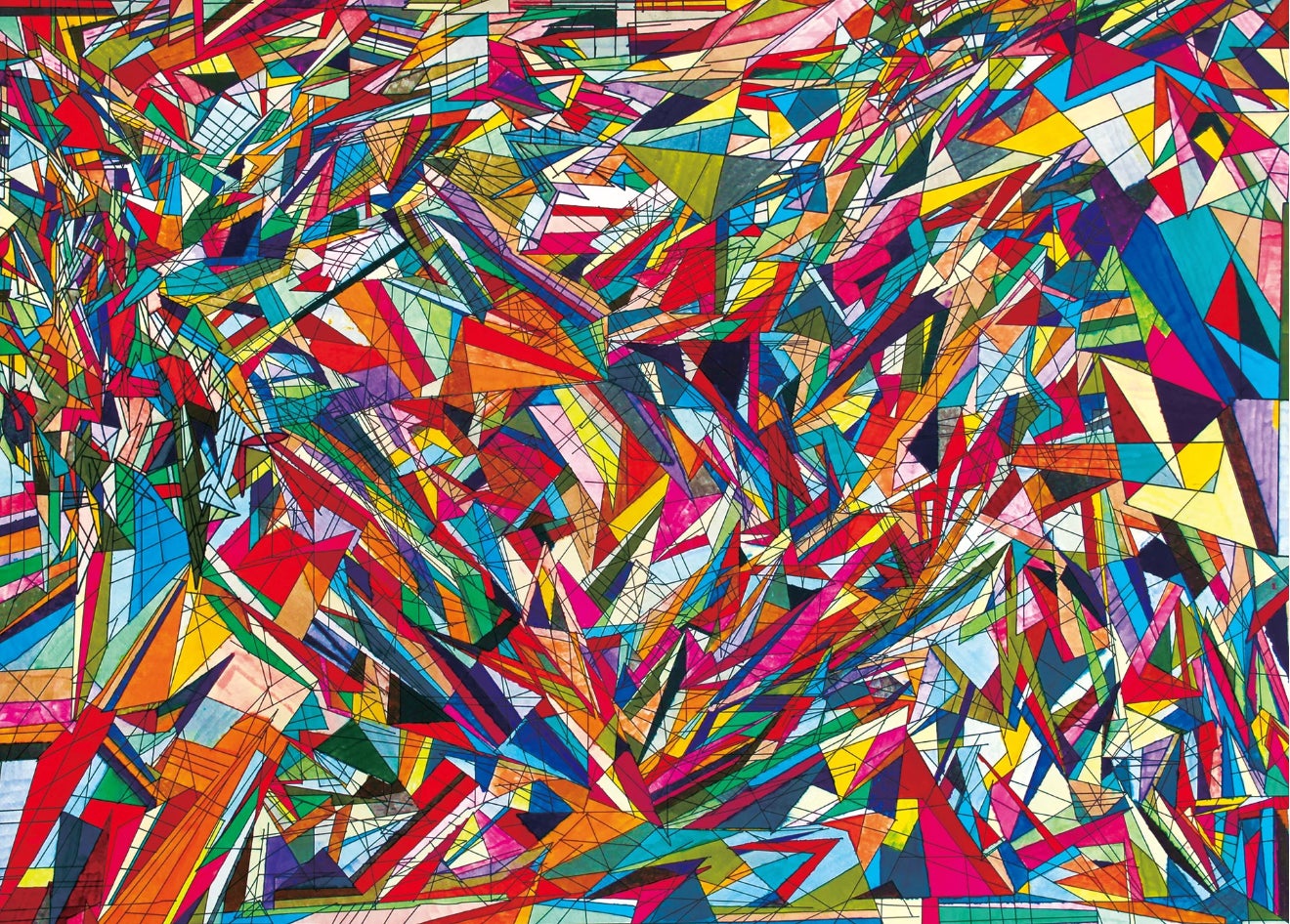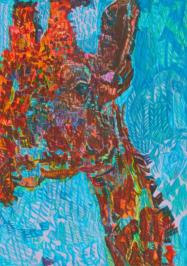 独自に生み出した楔形文字のような筆致(通称「キュニキュニ」)は、豊かな色彩とともに緻密に配され、心地よい輪郭の歪みの中に立体的な奥行きを創り出している。そのあまりの臨場感に、これらが写真のなかの平面的なモチーフを見て描かれたとはにわかに信じ難い。好きなテレビ番組のナレーションを呟きながら、普通の画用紙であれば破れてしまうほどの力強い筆圧と物凄いスピードでぐいぐいと描く。作品は国内外で評価されているが、当の本人は外界の雑音に無頓着。