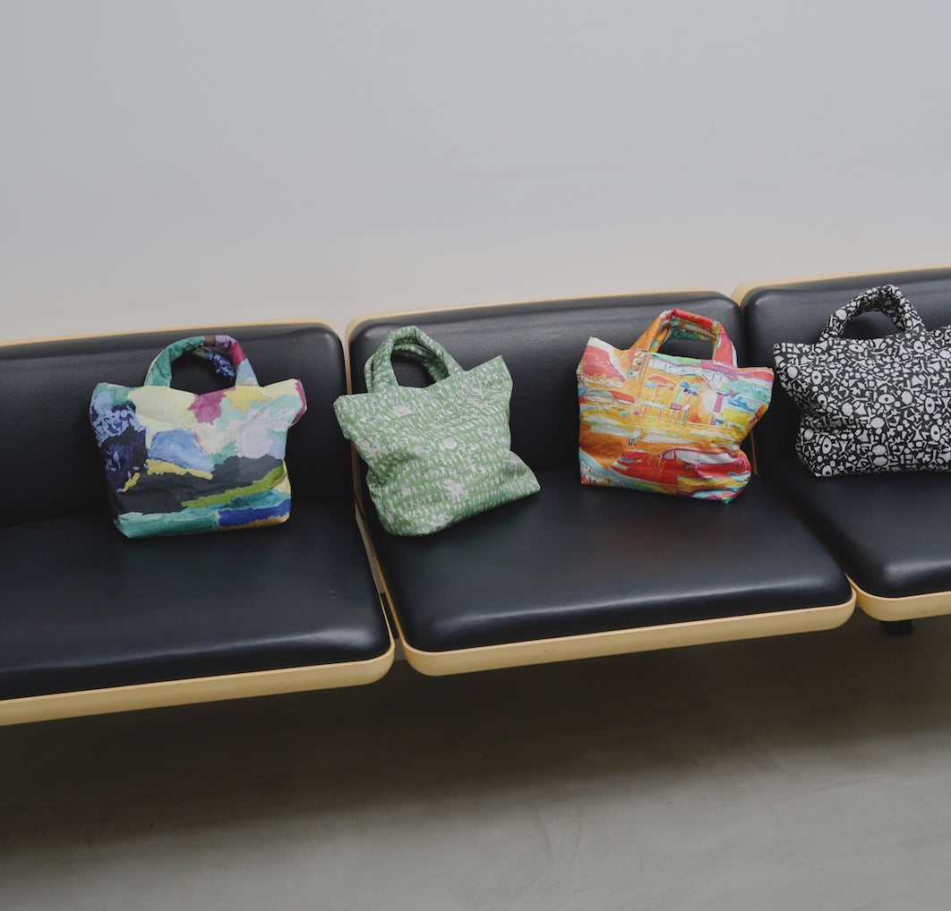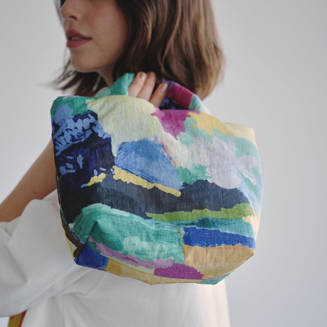 リサイクルナイロン生地にアートをプリントしたミニトートバッグ。ふんわりとしたシルエットが特徴で、季節を問わずファッションのアクセントとして活躍します。コンパクトなサイズながら、財布やスマホなどの必需品をしっかり収納。内面にはポケットを付け、スナップボタンでバッグの口を閉められる機能的な仕様を採用しました。ナイロン素材特有の軽さとカジュアルな雰囲気で、散歩や買い物といった日常シーンを彩ります。