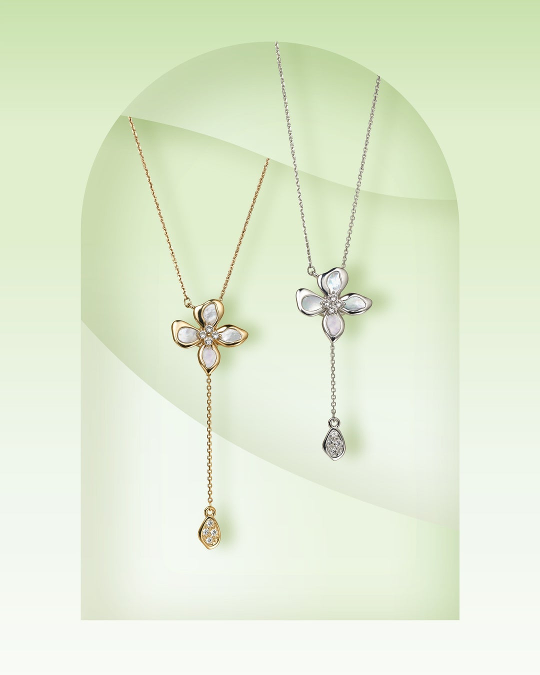 上品な光沢が美しい白蝶貝でかたどった花びらは、一枚一枚違う表情で華やかな印象。