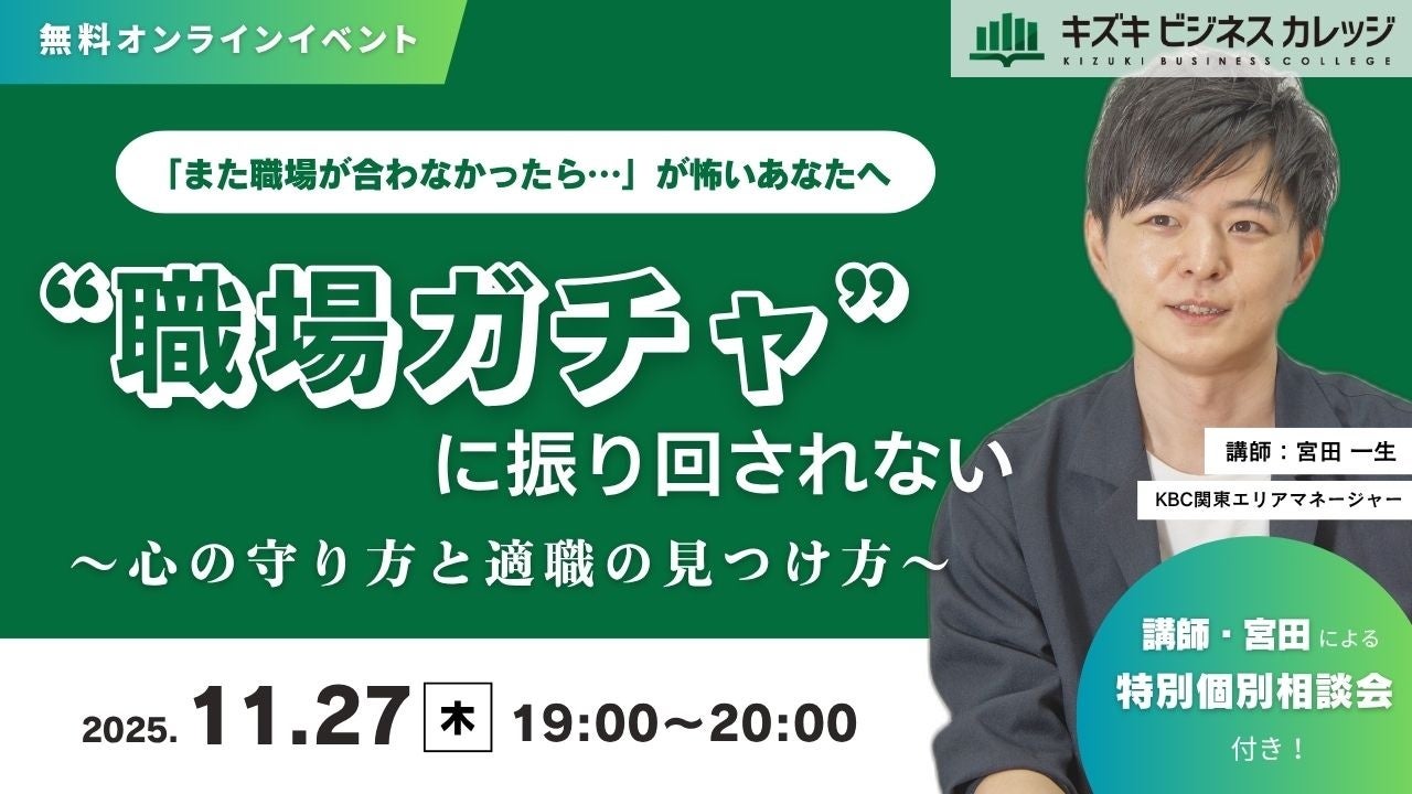 就労移行支援事業所・キズキビジネスカレッジ(KBC)は、2025年11月27日(木)に、「“職場ガチャ”に振り回されない、心の守り方と適職の見つけ方」をテーマとした無料オンライン講演を開催します。