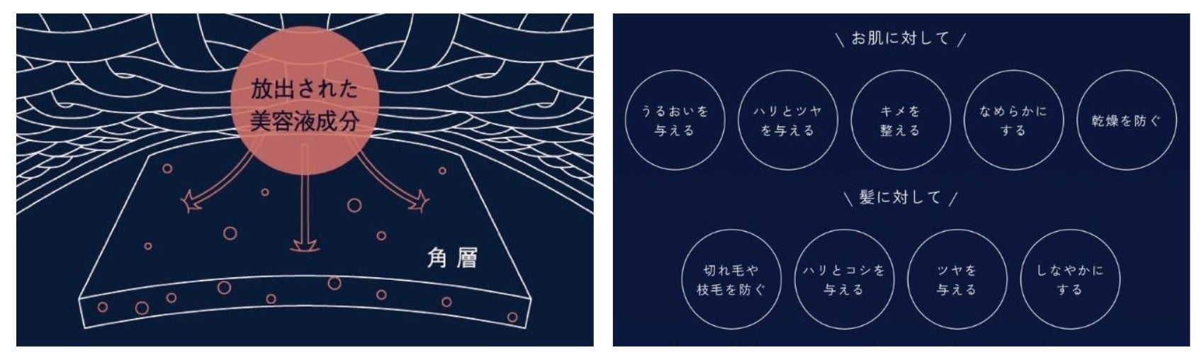 このピローケースは布製品でありながら、医薬品医療機器等法による「化粧品」として届出された商品で、繊維内に美容液成分のビタミンE(※2)を貯蔵し、肌が触れると摩擦や体温に反応してビタミンE (※2)が放出され、肌(角層まで)に浸透し、寝ている間に肌や髪へうるおい(※1)を与えます。