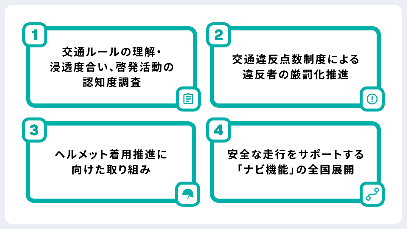 違反者の罰則制度、ヘルメットの着用促進やナビ機能の全国展開など