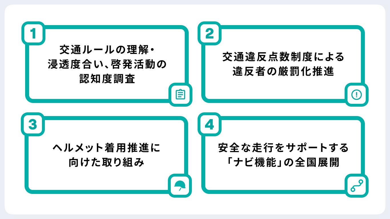 その上で、以下の4つのアクションを2024年から2025年にかけて実施することで、LUUPを利用する全ての方と、LUUPのある街に暮らす全ての方の安全・安心を目指します。