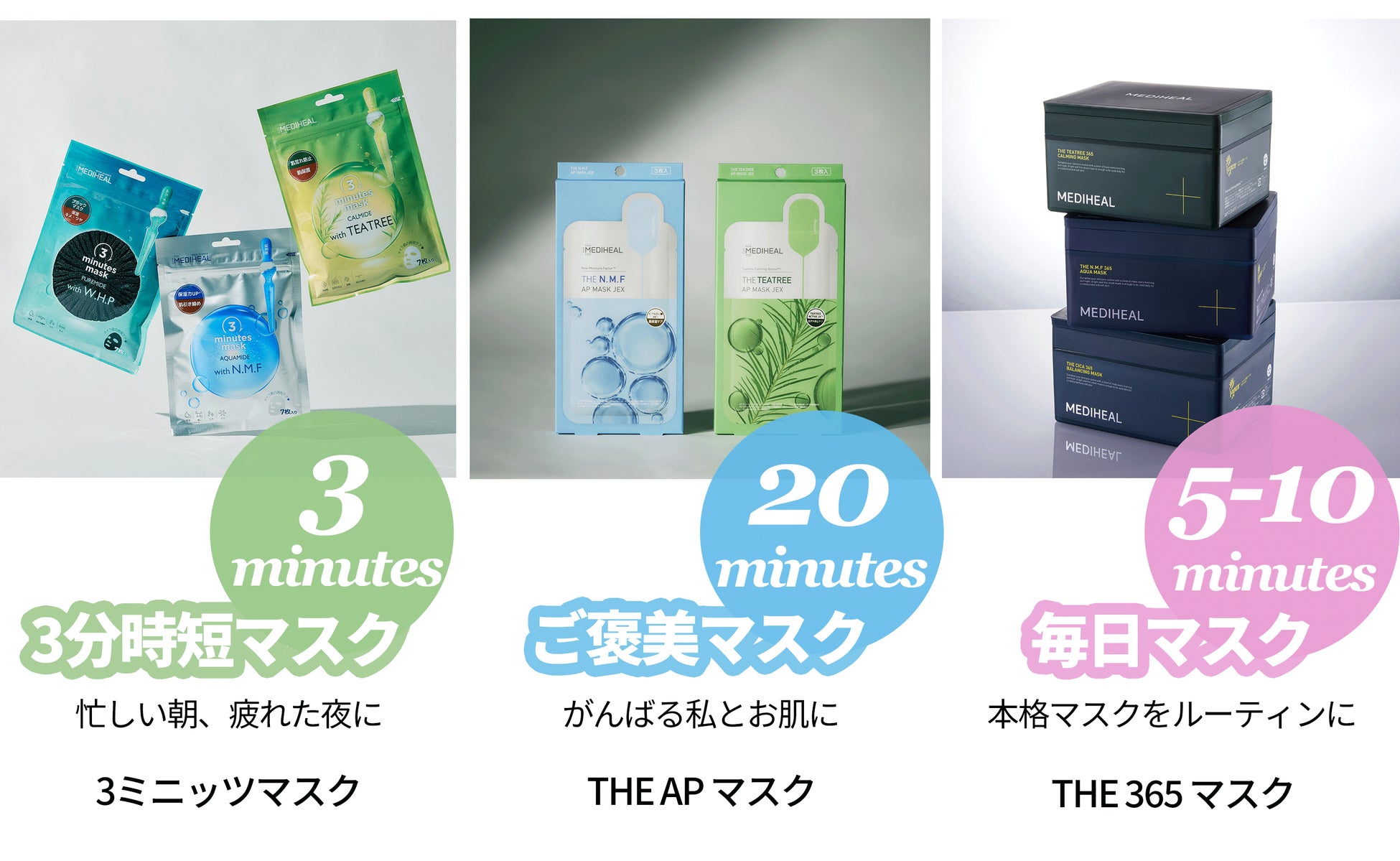 保湿ケアの『3ミニッツマスク アクアマイド with N.M.F』と、肌あれ防止ケアの『3ミニッツマスク カーマイド with ティーツリー』、ハリ・ツヤケアの『3ミニッツマスク ピュアマイド with W.H.P』の3種類です。