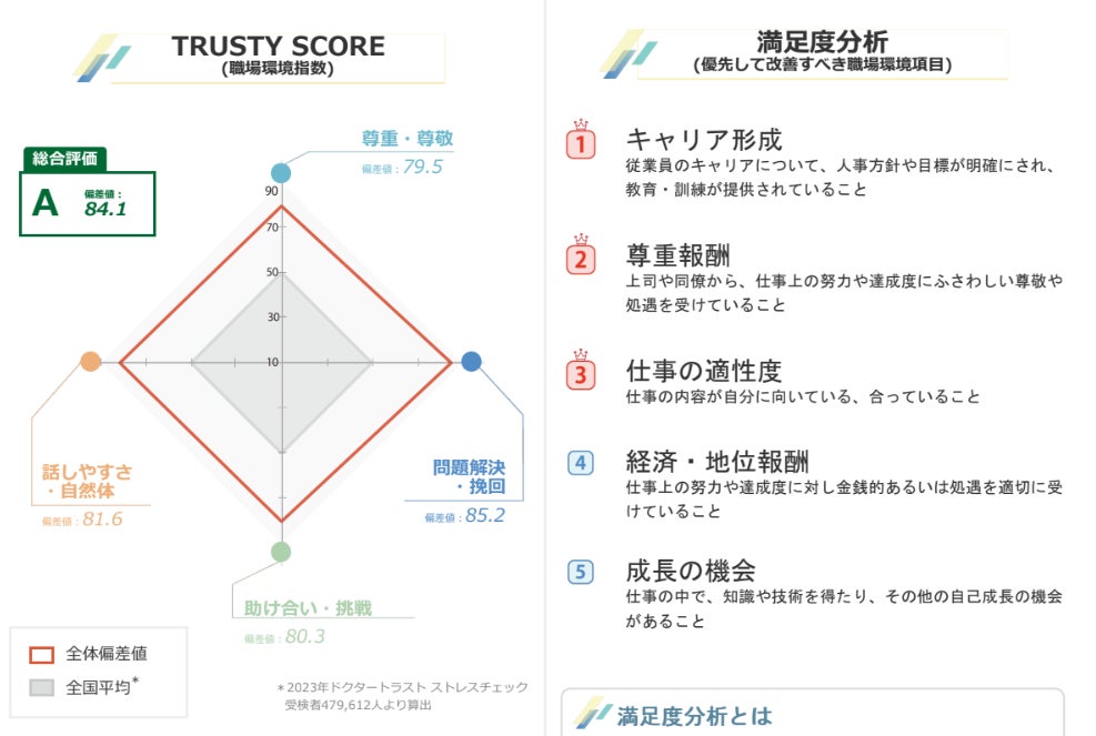 ストレスチェックの各設問の回答結果から、ドクタートラストが定める職場環境指数(TRUSTY SCORE)の偏差値が算定され、信頼関係が強く生産性の高い職場であるかどうかが評価されました。その結果、当社は算定4領域(①尊重・尊敬 ②問題解決・挽回 ③助け合い・挑戦 ④話しやすさ・自然体)の全てで偏差値79以上を記録し、総合偏差値84.1と評価されました。(全国平均偏差値:50)