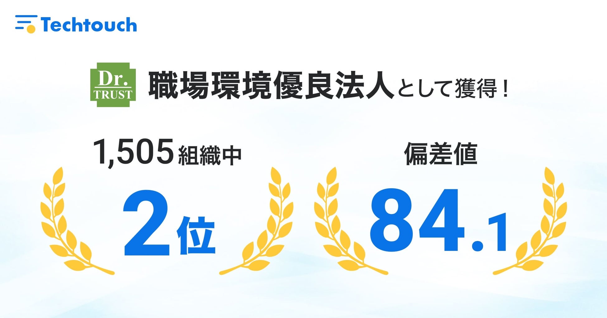 テックタッチ株式会社は、企業の健康管理支援を手がける株式会社ドクタートラストが提供する「ストレスチェック」のうち、職場の雰囲気の良さと生産性の高さを示す「職場環境指数(TRUSTY SCORE)」の分析結果にて、2024年度にストレスチェックを実施した1,777組織(約55.6万名)のうち、80問版を実施した1,505組織を対象に集団分析を行った結果、回答者数101人〜500人(619組織)で2位を獲得したことをお知らせします。3年連続のランクインとなります。