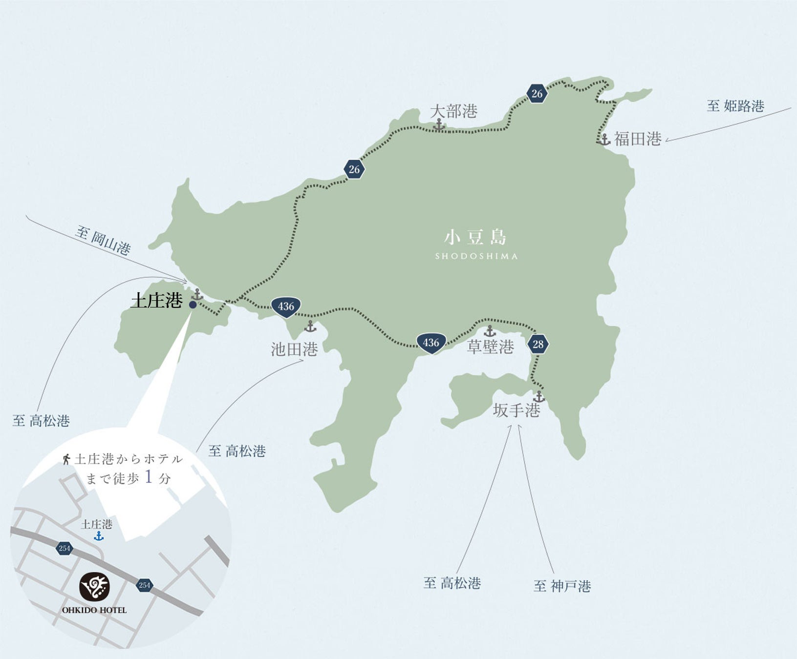 新岡山港からフェリーで約70分(土庄港着) https://ryobi-shodoshima.jp/access/access_okayama/