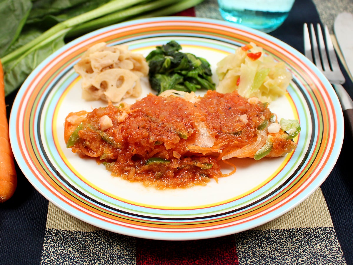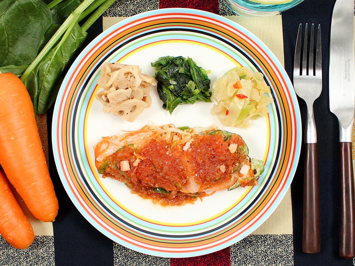 甘酸っぱい味が特徴の定番料理、南蛮漬けを洋風に仕上げました。銀鮭をしっとりとローストし、トマトの酸味と甘みにチーズのコクをプラスしたソースをかけました。細く切った玉ねぎ、人参、ピーマンのお野菜とご一緒にお召し上がり下さい。副菜は、オニオンドレッシングで和えたれんこんツナサラダ、鶏ガラ風味のほうれん草ソテー、コンソメ味のキャベツマリネです。