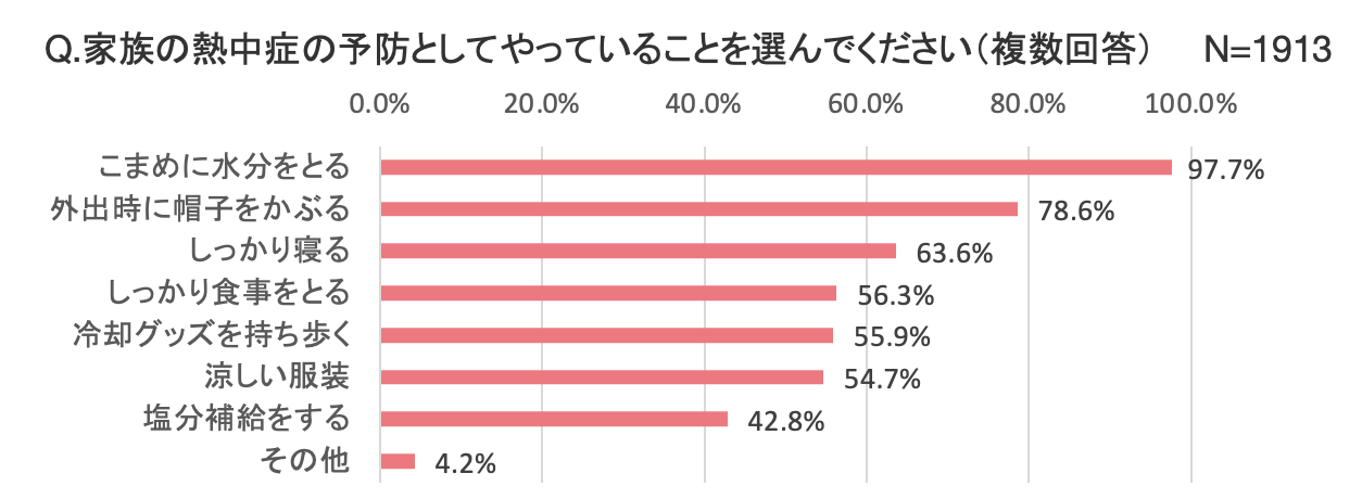家族の熱中症対策としてやっていることを聞いたところ、6つの項目で半数を超える結果に。日々熱中症に対して気を付けていることが伺えます。中でも 、「こまめに水分をとる」「外出時に帽子をかぶる」の2つが特に多いことから、外出時の対策を重点的にしているようです。