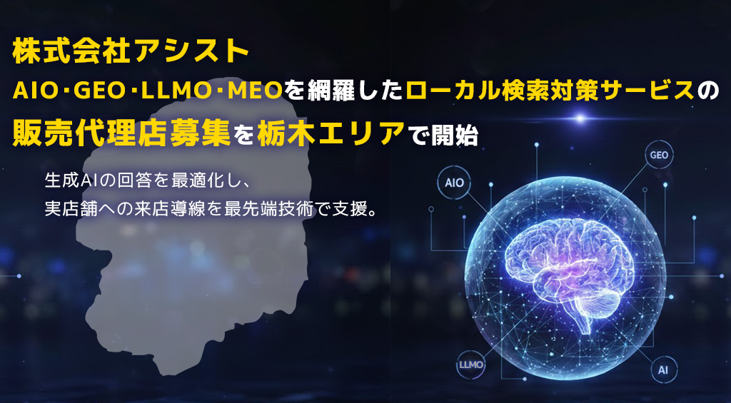 株式会社アシスト AIO・GEO・LLMO・MEOを網羅したローカル検索対策サービスの販売代理店募集を栃木エリアで開始。生成AIの回答を最適化し、実店舗とユーザーの出会いを最先端技術で支援。 コピー