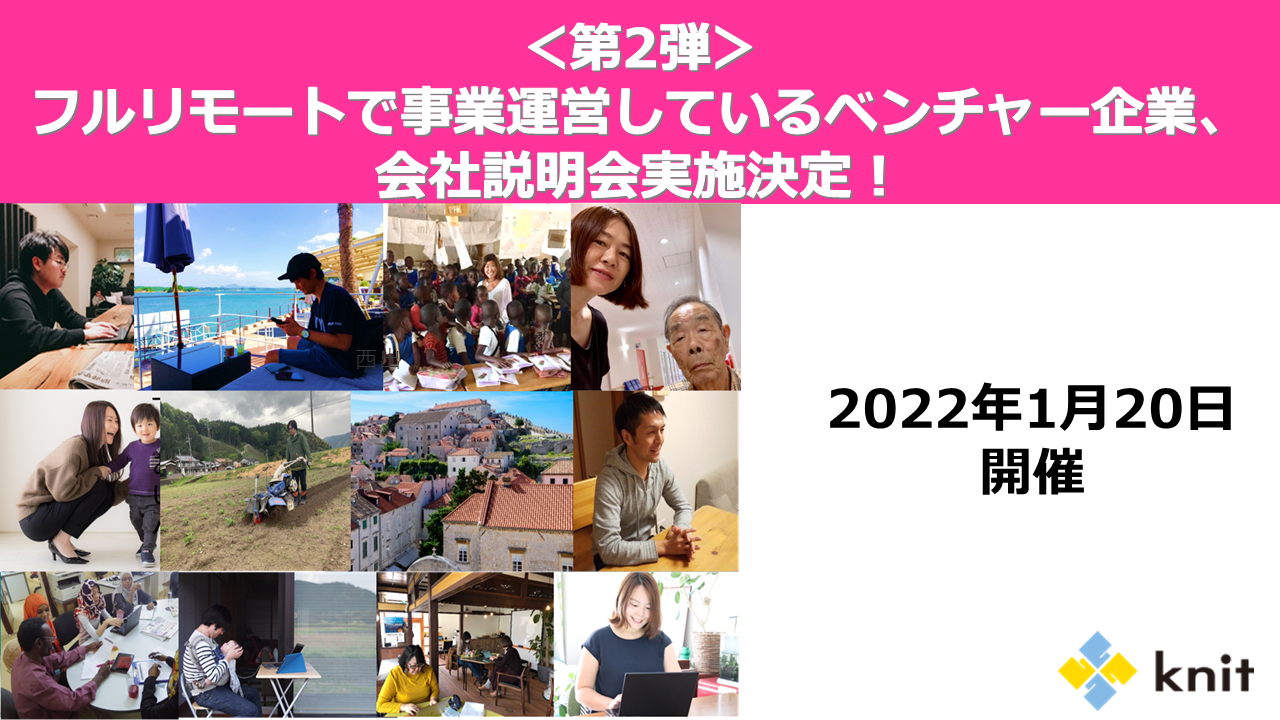 オンラインアウトソーシングサービス「HELP YOU(ヘルプユー)」を運営する株式会社ニット(本社:東京都品川区、代表取締役社長:秋沢崇夫、以下ニット)は、2015年よりフルリモート前提で創業、現在、約400人が日本全国・世界33カ国からオンラインで業務を遂行しています。このたび23卒・24卒の大学生・大学院生、既卒・中途社員に向けて、「多様な働き方をしている社会人と話そう!株式会社ニット会社説明会」を令和4年1月20日(木)に実施いたします。新型コロナウィルスの感染拡大防止策として、オンライン上での実施いたします。本イベントは2022年入社の内定者かつ現在インターン生として当社在籍している山形大学の学生が企画をいたしました。みなさまのご参加お待ちしております。