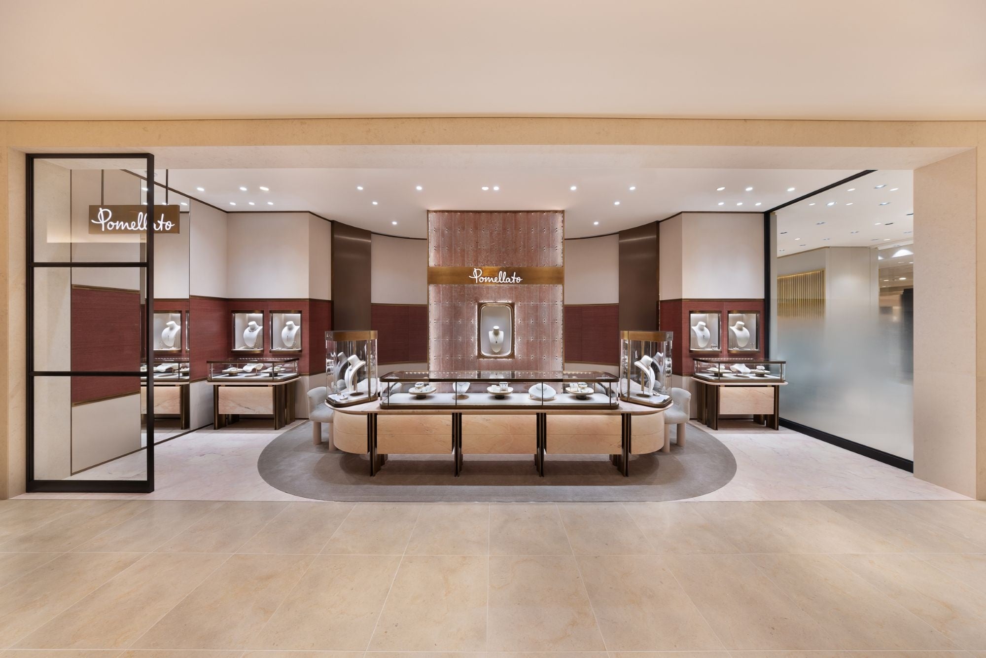 ポメラートブティック 阪急うめだ本店は、フロアに向けて明るく開かれた構造を採用し、ブランドを象徴するセンシュアルな曲線美と卓越した職人技を体現しています。店内中央には、ミラノの照明デザイナー6:AMによるガラスエレメントを用いたウォールを配置。淡いピンクトーンのガラスタイルが柔らかく光を反射し、ジュエリーの輝きを引き立てるとともに、空間に視覚的なリズムをもたらします。