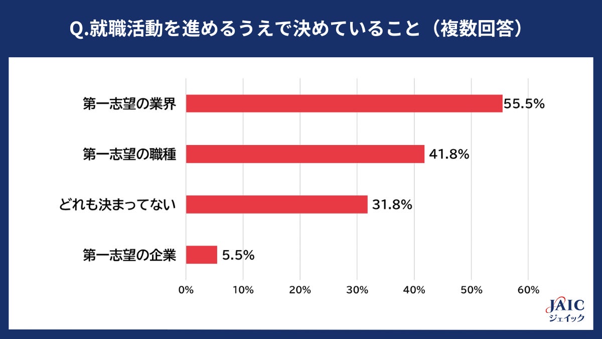 「就職活動を進めるうえで、決めていることはありますか?当てはまるものをすべて選択してください」と質問したところ、「第一志望の業界」が55.5%、「第一志望の職種」が41.8%、「どれも決まってない」が31.8%、「第一志望の企業」が5.5%となりました。
