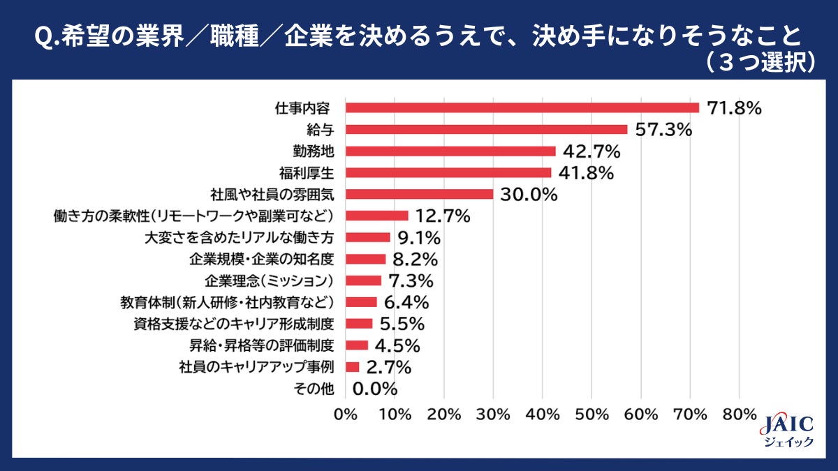 「希望の業界/職種/企業を決めるうえで、決め手になりそうなことは何ですか?特に当てはまるものを3つ選択してください」と質問したところ、「仕事内容」が71.8%、「給与」が57.3%、「勤務地」が42.7%、「福利厚生」が41.8%、「社風や社員の雰囲気」が30.0%、「働き方の柔軟性(リモートワークや副業可など)」が12.7%、「大変さを含めたリアルな働き方」が9.1%、「企業規模・企業の知名度」が8.2%、「企業理念(ミッション)」が7.3%、「教育体制(新人研修・社内教育など)」が6.4%、「資格支援などのキャリア形成制度」が5.5%、「昇給・昇格等の評価制度」が4.5%、「社員のキャリアアップ事例」が2.7%、「その他」が0%となりました。