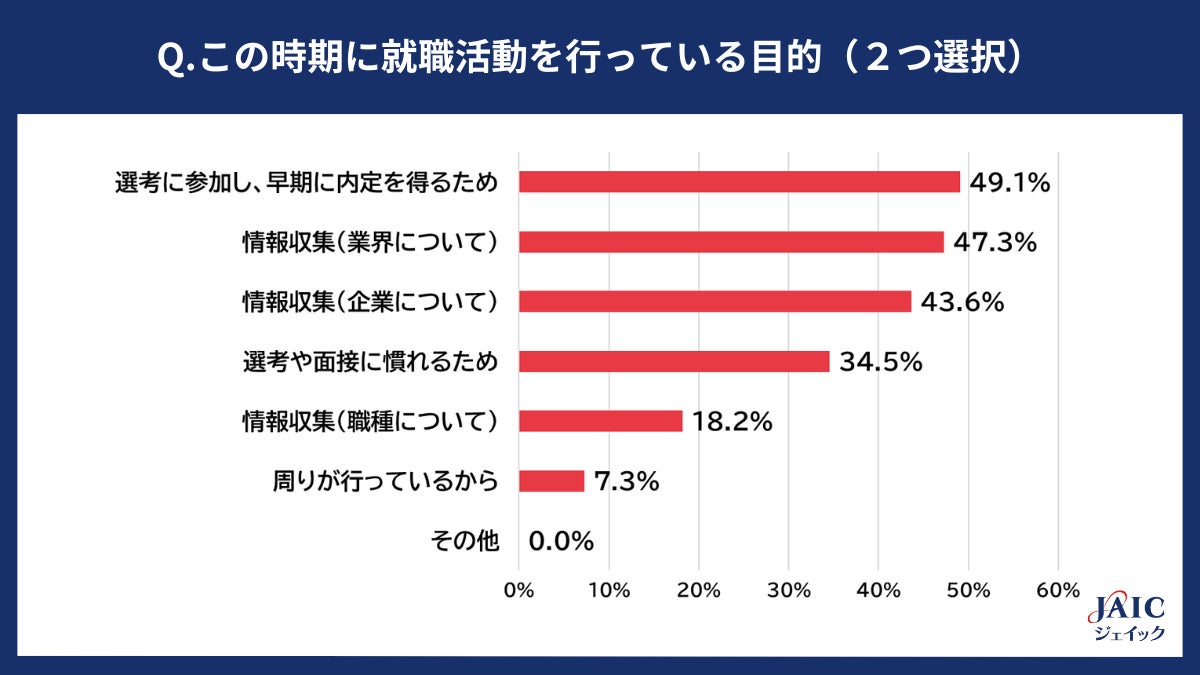 「この時期に就職活動を行っている目的は何ですか?特に当てはまるものを2つ選択してください」と質問したところ、「選考に参加し、早期に内定を得るため」が49.1%、「情報収集(業界について)」が47.3%、「情報収集(企業について)」が43.6%、「選考や面接に慣れるため」が34.5%、「情報収集(職種について)」が18.2%、「周りが行っているから」が7.3%、「その他」が0%となりました。