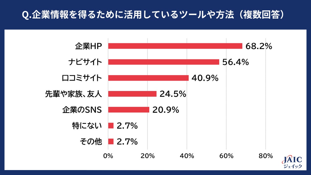 1位「企業HP」(68.2%)、2位「ナビサイト」(56.4%)、3位「口コミサイト」(40.9%)