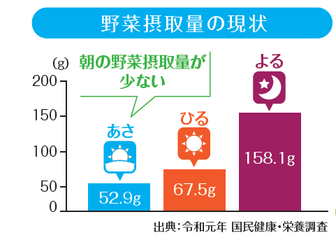 日本人の平均的な野菜摂取量は約280gで、国(厚生労働省健康日本21)が目標とする350g以上に約70g足りておらず、特に3食のうち、朝食での野菜摂取量が少なくなっています。