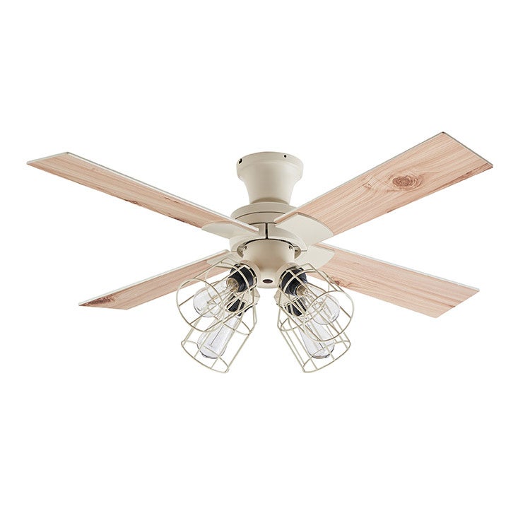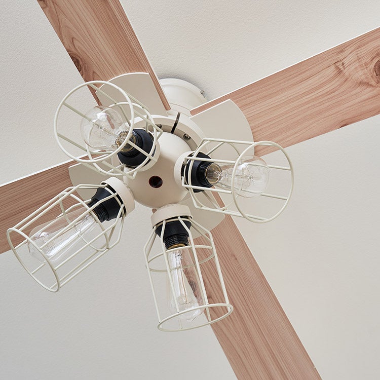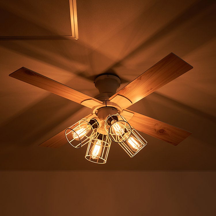 本体、羽根×4(リバーシブル)、シェード×4、 固定リング×4(本体装着済)、取付金具(本体装着済)、 リモコン、取付ネジ一式、エジソンバルブ×4、 取扱説明書(保証書付) ※リモコン用の単4電池×2本は付属しておりません。 |