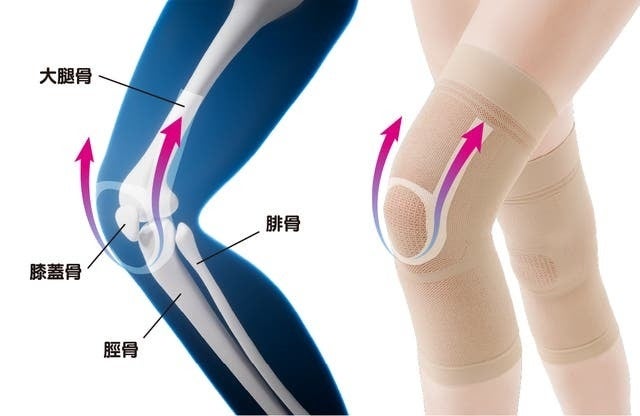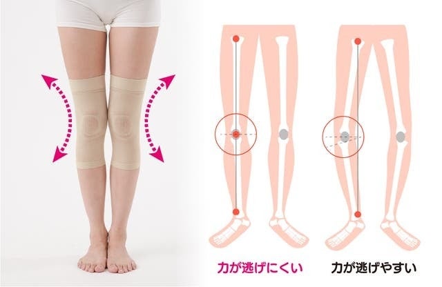 ひざのお皿(膝蓋骨)部分は、縦にも横にもよく伸びるやわらかいメッシュ編みを採用し、曲げ伸ばしがしやすくなっています。これにより、ひざのお皿をしっかり固定し、ブレを抑えます。